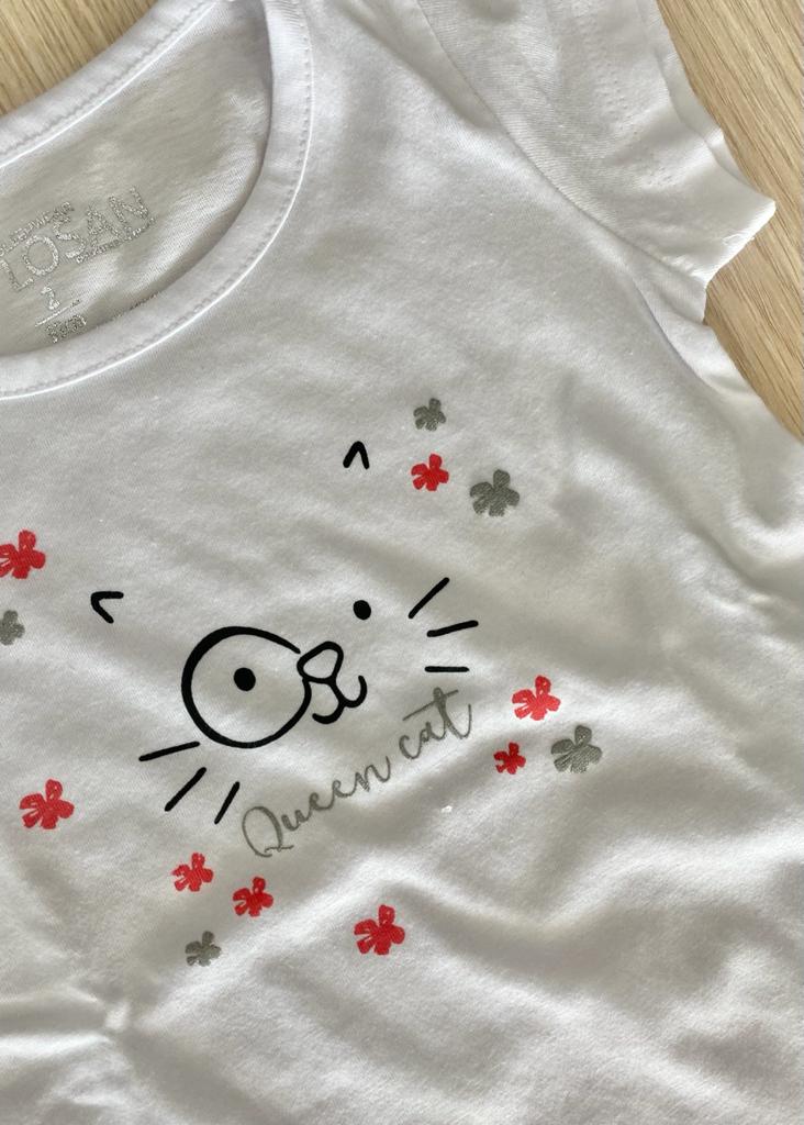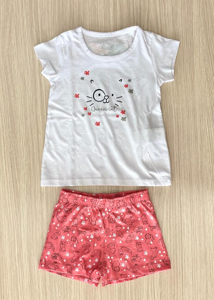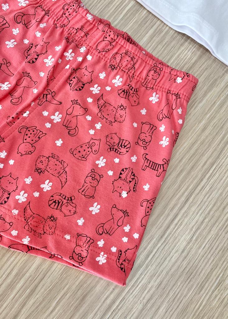 Pigiama bambina due pezzi in morbido cotone, di colore bianco e corallo, con dettagli di vari colori.