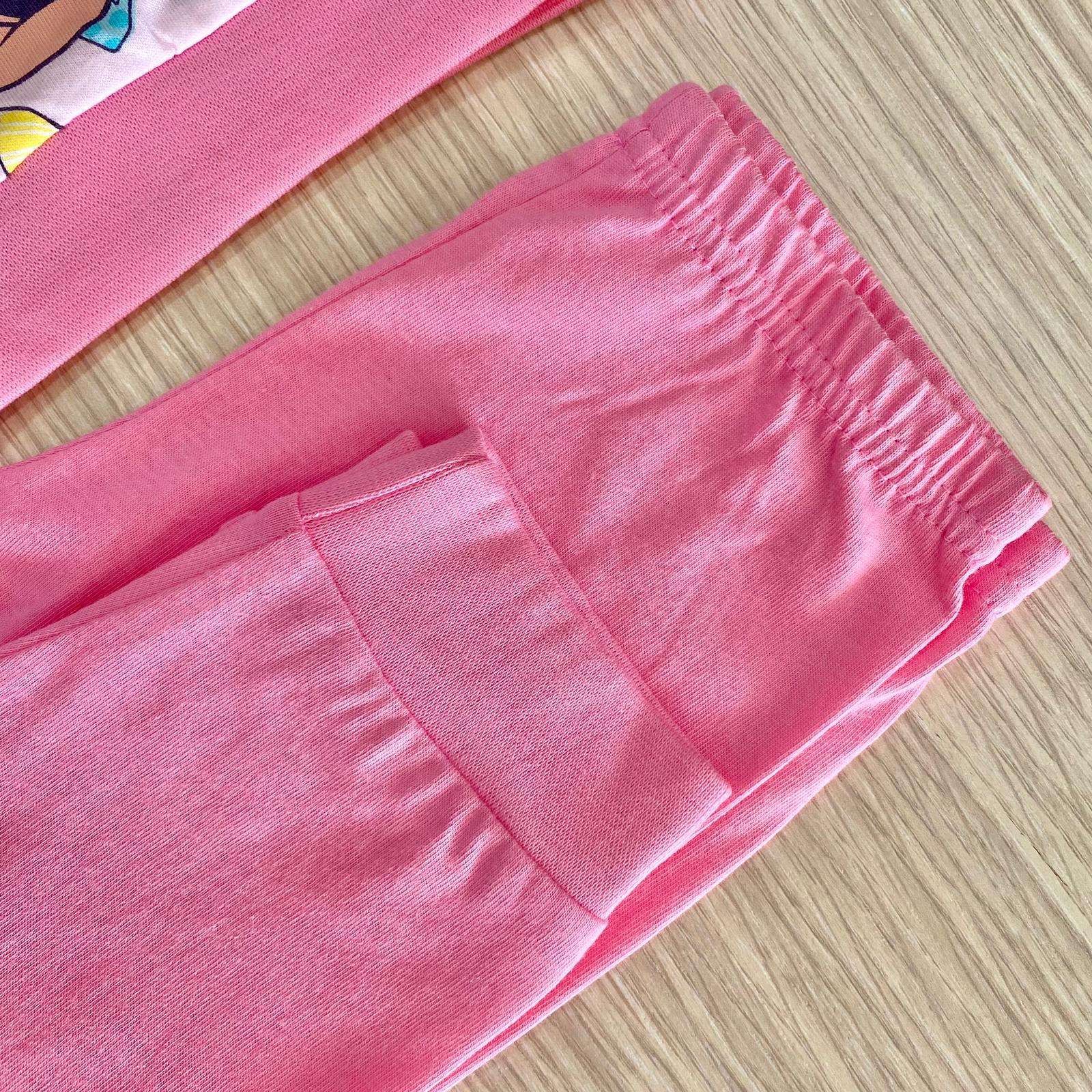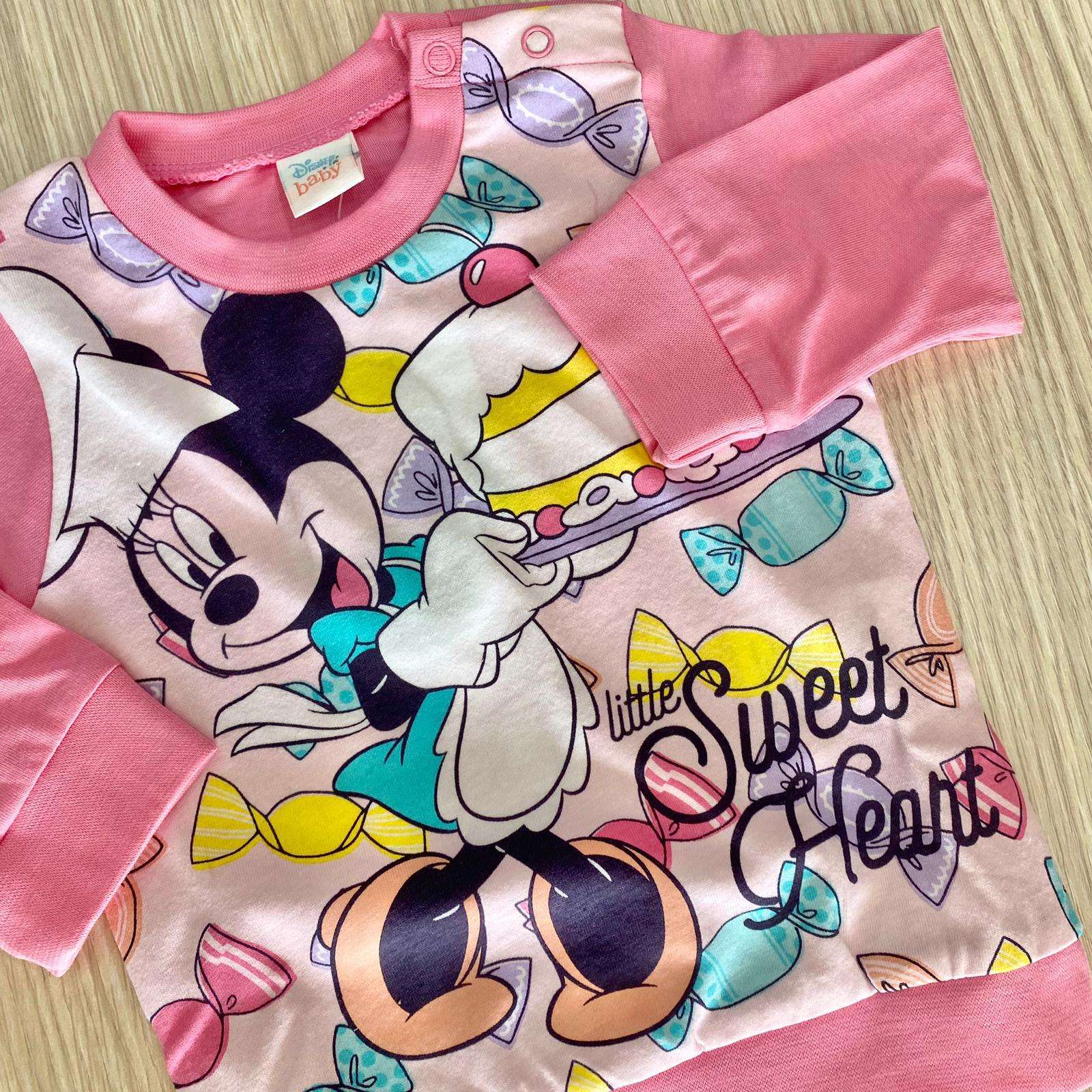 Pigiama due pezzi bambina in cotone, di colore rosa, con stampa Minnie di vari colori.