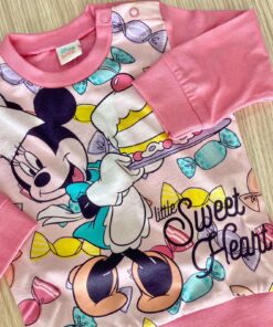 Pigiama due pezzi bambina in cotone, di colore rosa, con stampa Minnie di vari colori.
