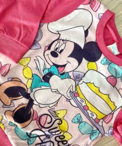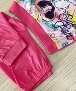 Pigiama due pezzi bambina in cotone, di colore fucsia e rosa, con stampa Minnie di vari colori.