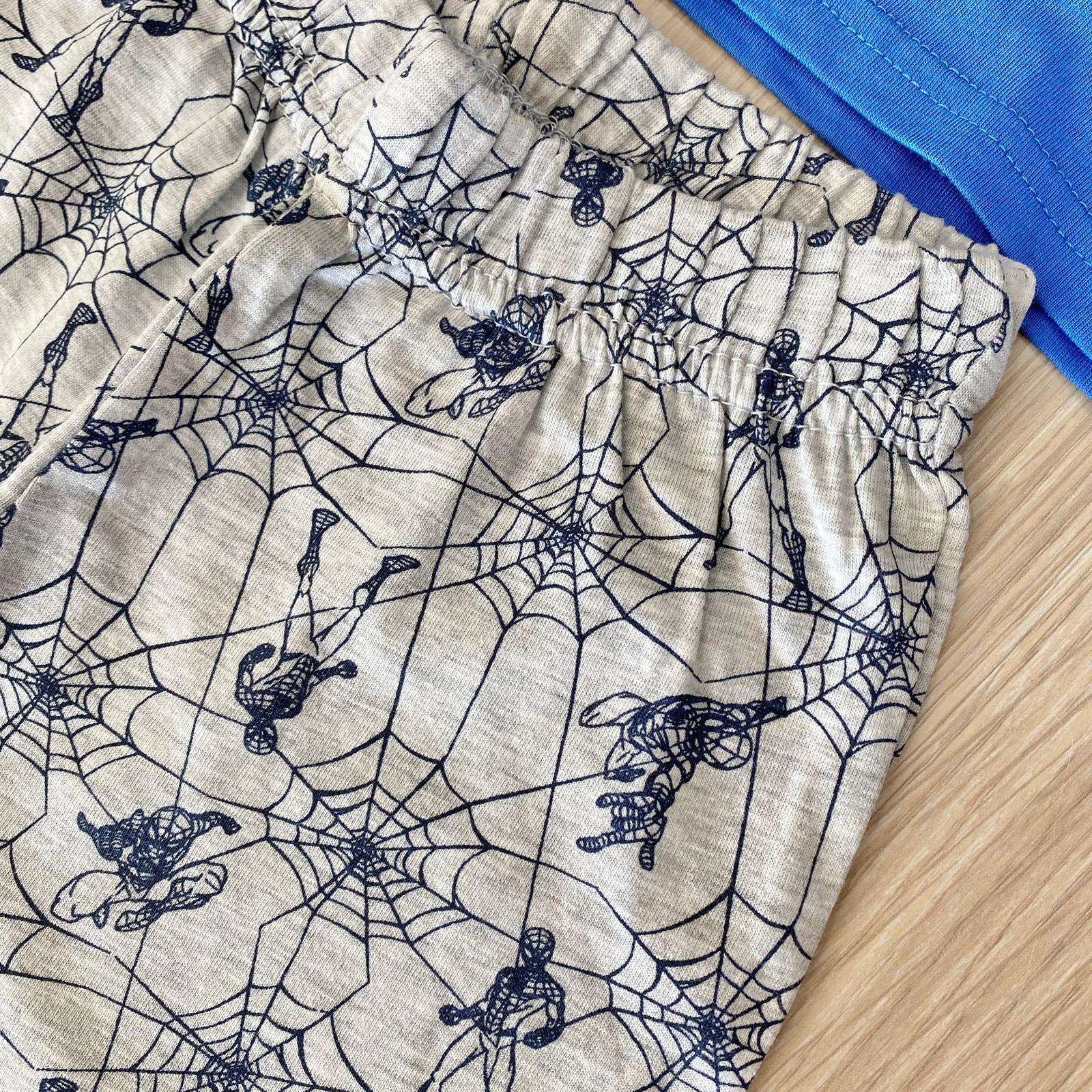 Pigiama due pezzi bambino in cotone, di colore blu e grigio, con stampa di vari colori.