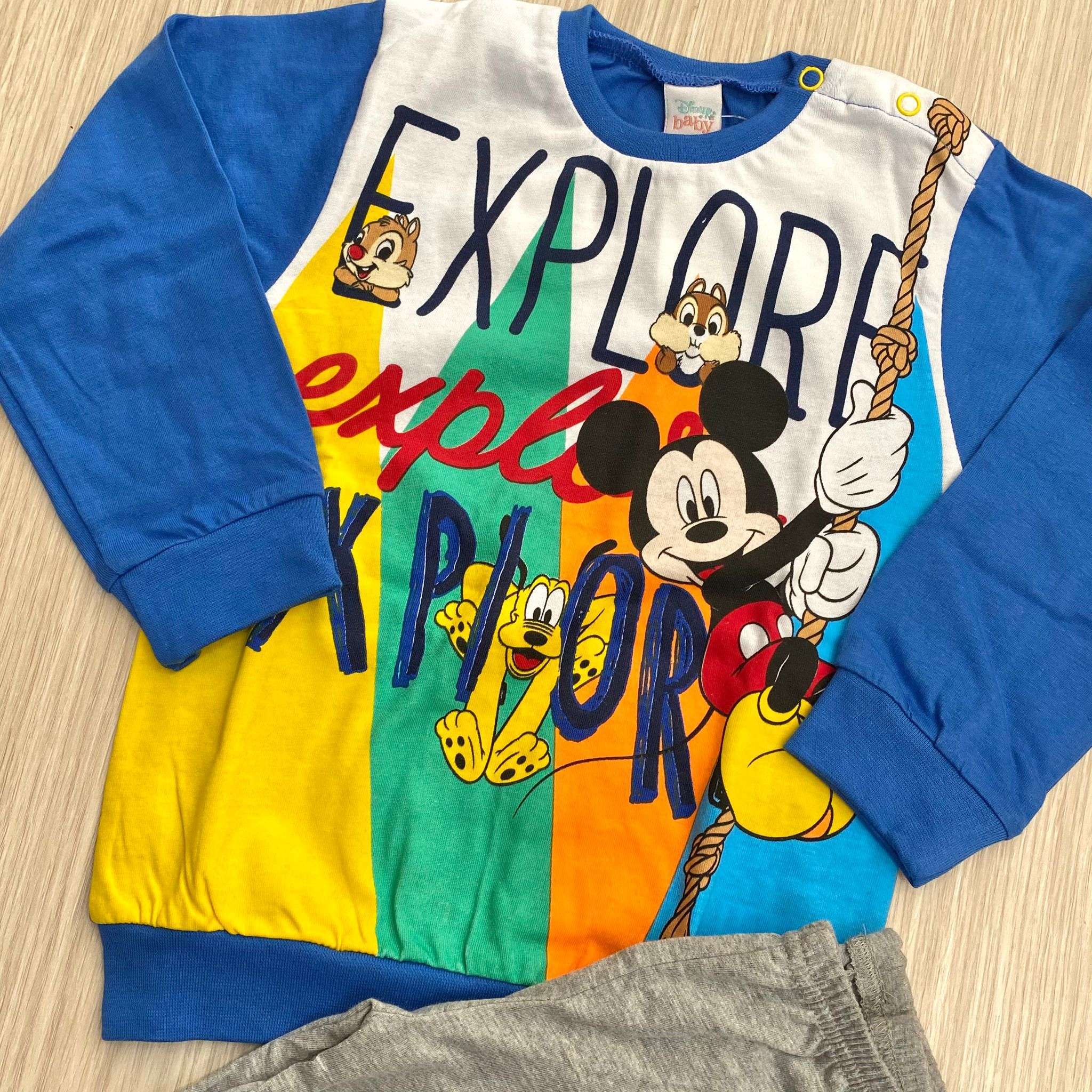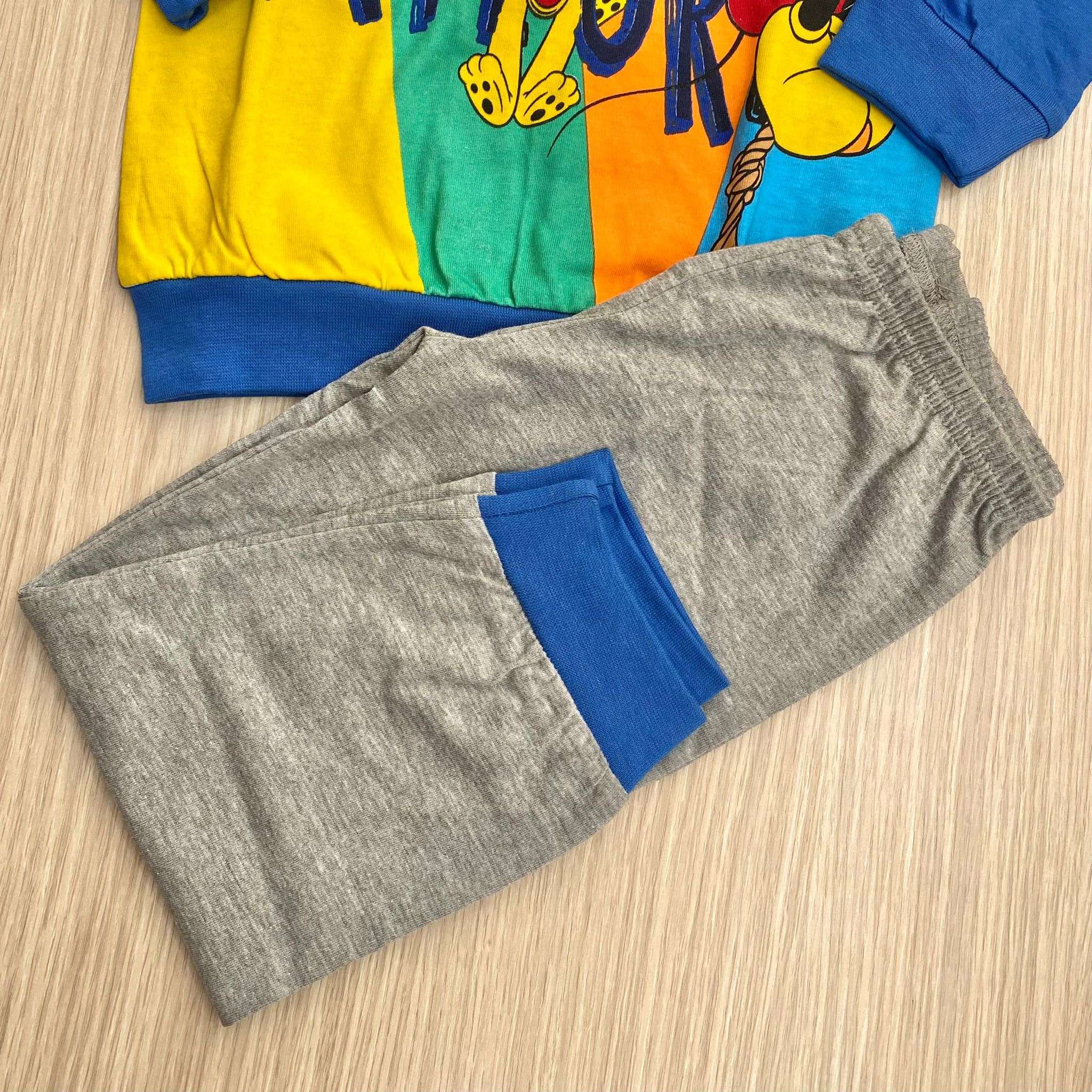 Pigiama bambino in cotone, di colore grigio, bianco e blu, con stampa di vari colori. Pigiama con polsini.