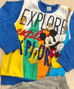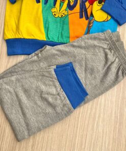 Pigiama bambino in cotone, di colore grigio, bianco e blu, con stampa di vari colori. Pigiama con polsini.