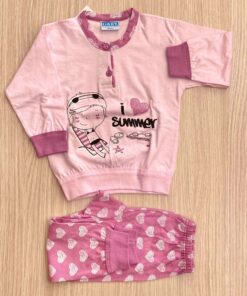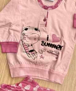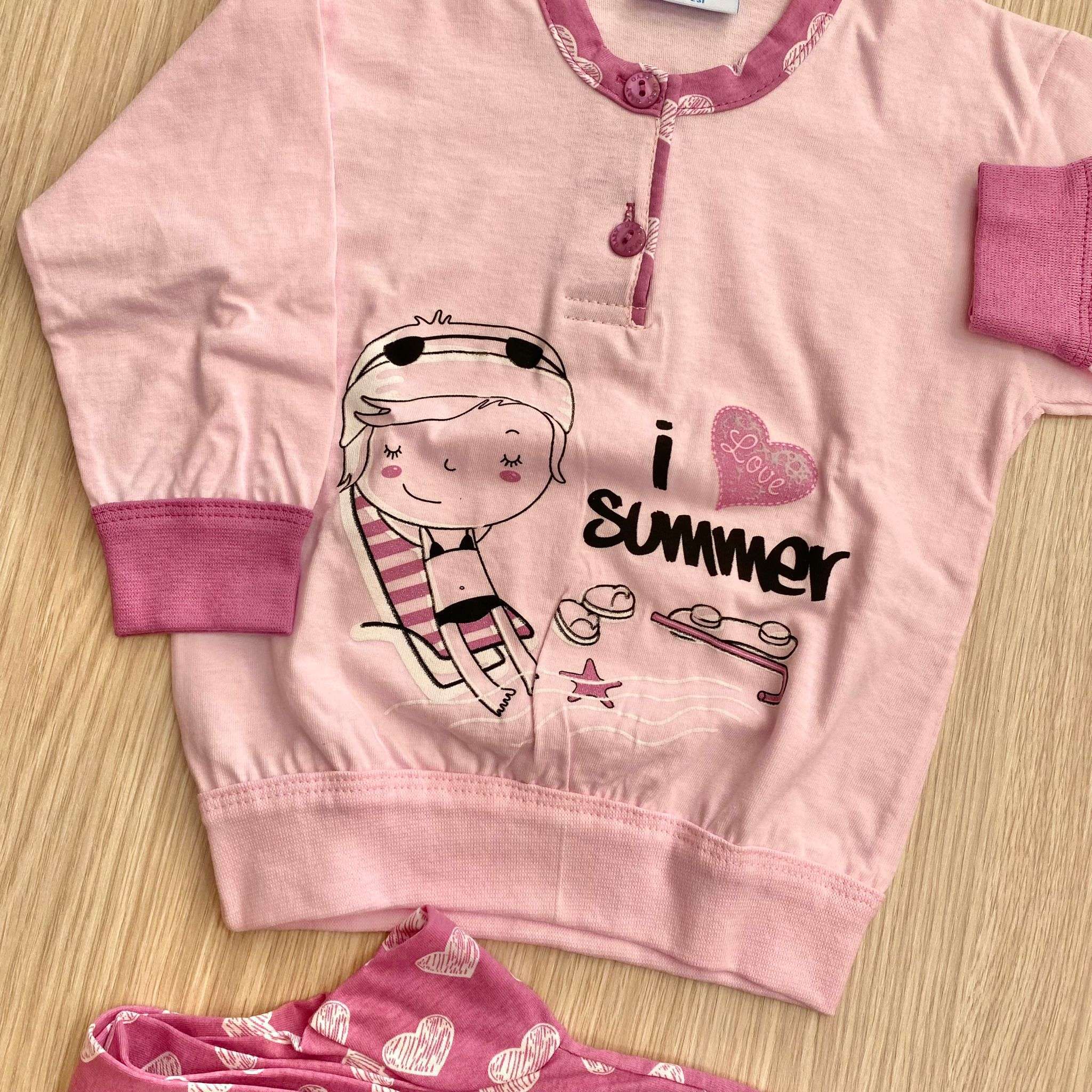 Pigiama bambina in cotone, rosa, con stampa di vari colori.