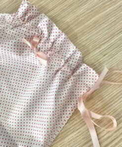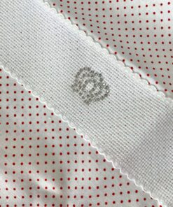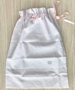 Sacca nascita neonata in cotone con dettaglio di tela aida, di colore bianco e rosso, con applicazione di strass.