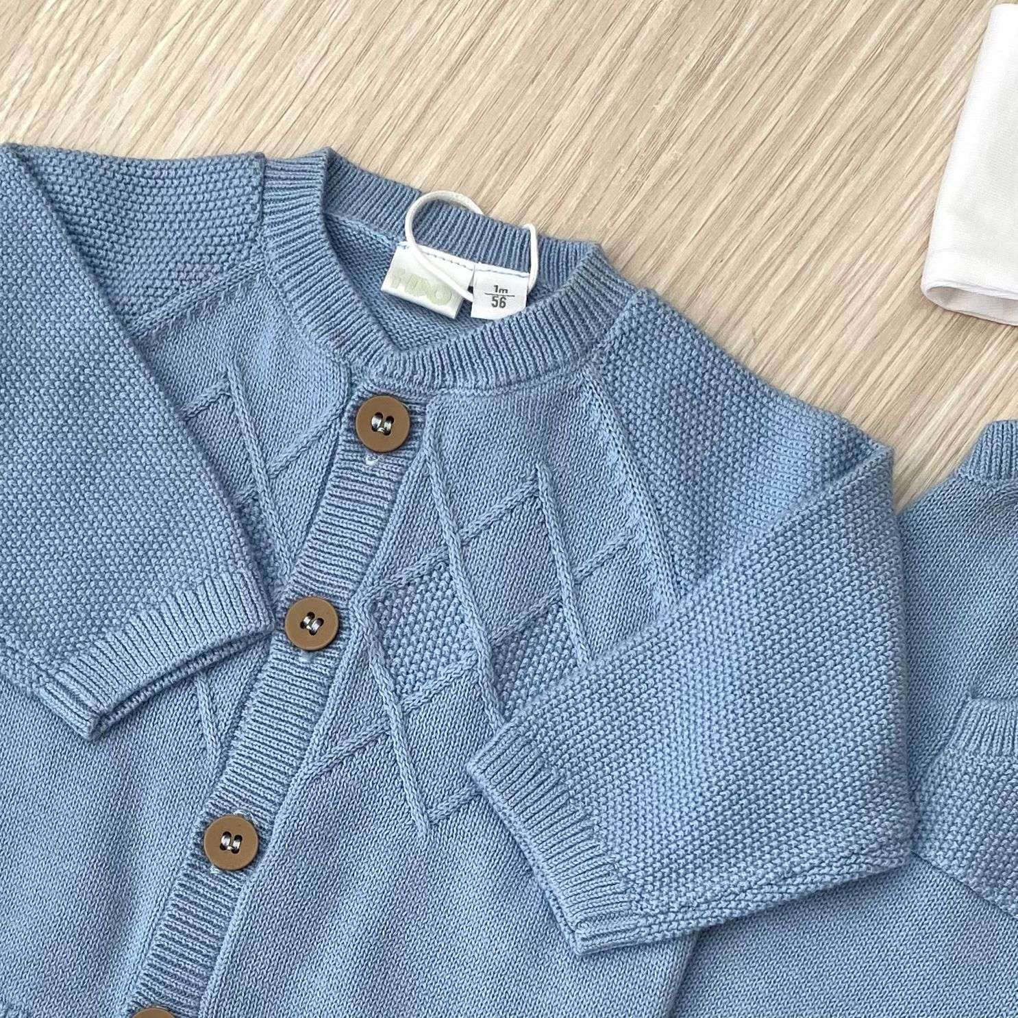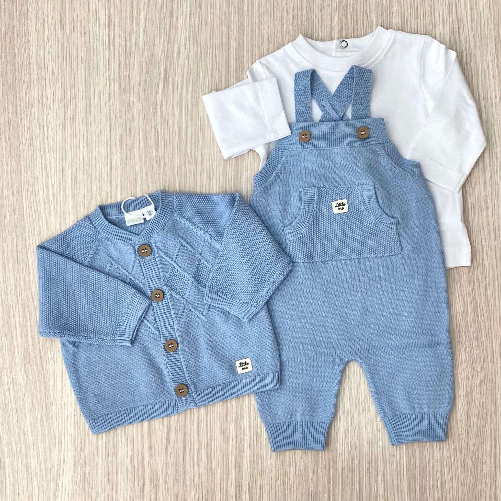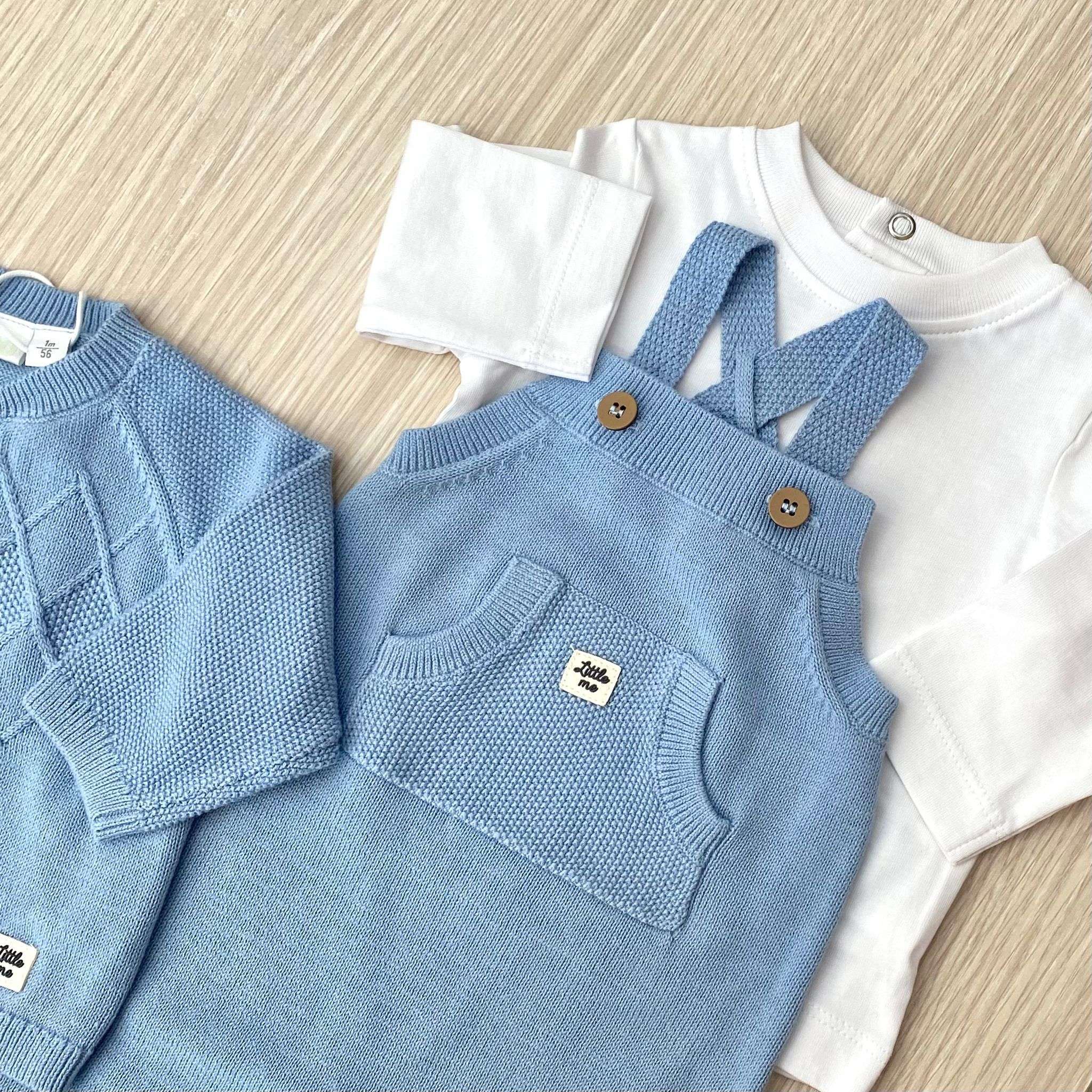 Salopette tre pezzi iDO, in filo di cotone , di colore azzurro con simpatica tasca sul davanti ,dotata di due bottoncini regolabili,magliettina in cotone di colore bianco,infine per concludere un bellissimo cardigan sempre in filo di cotone.
