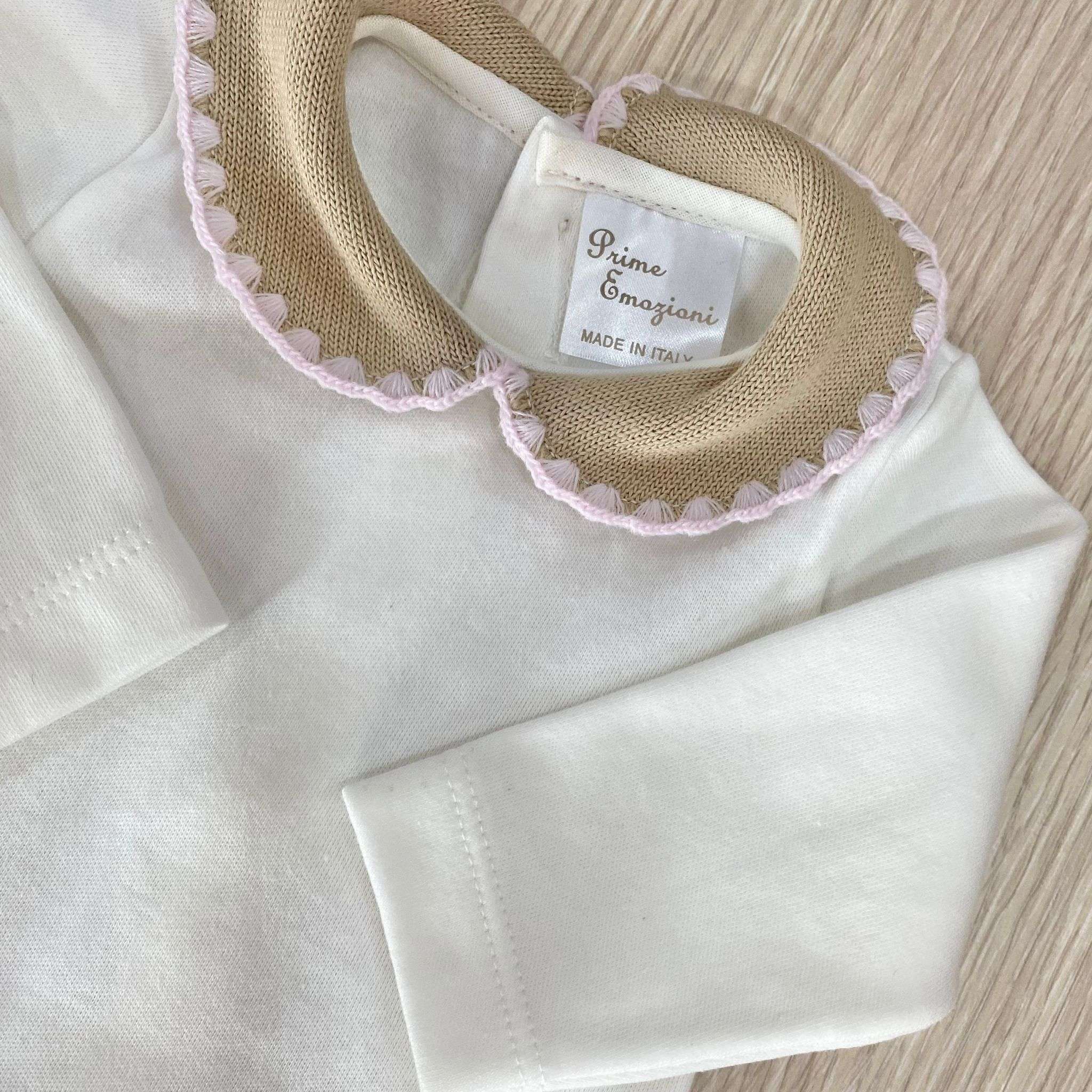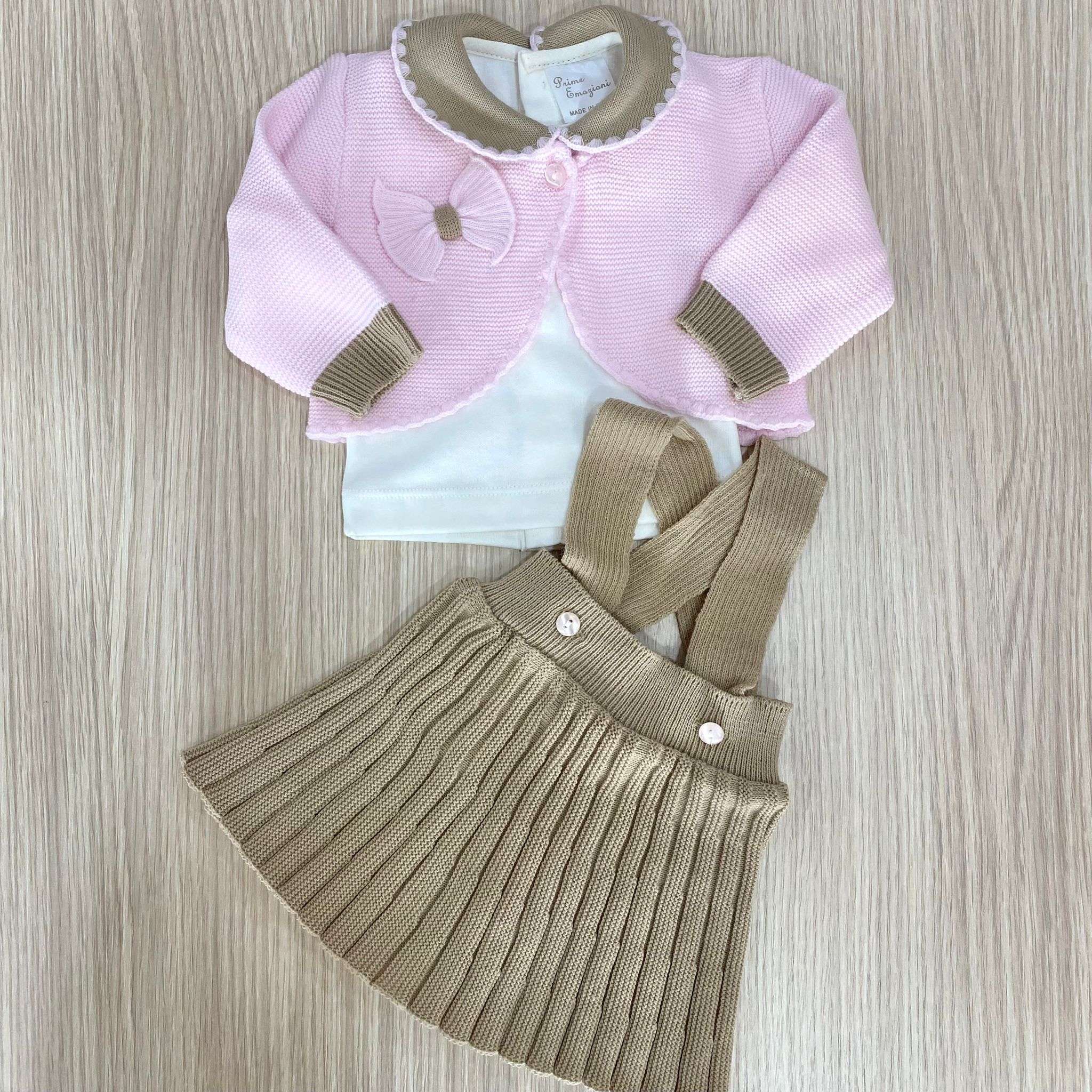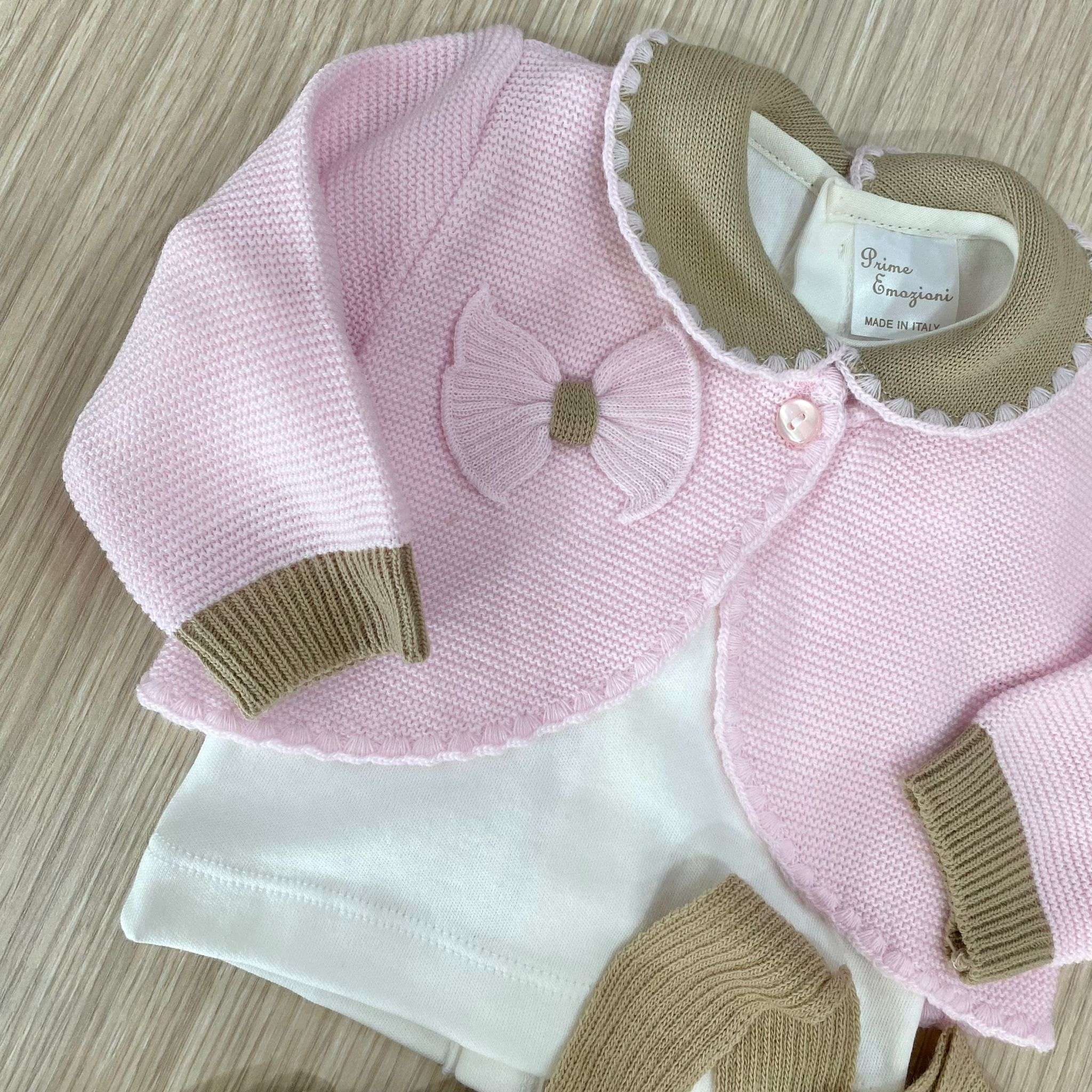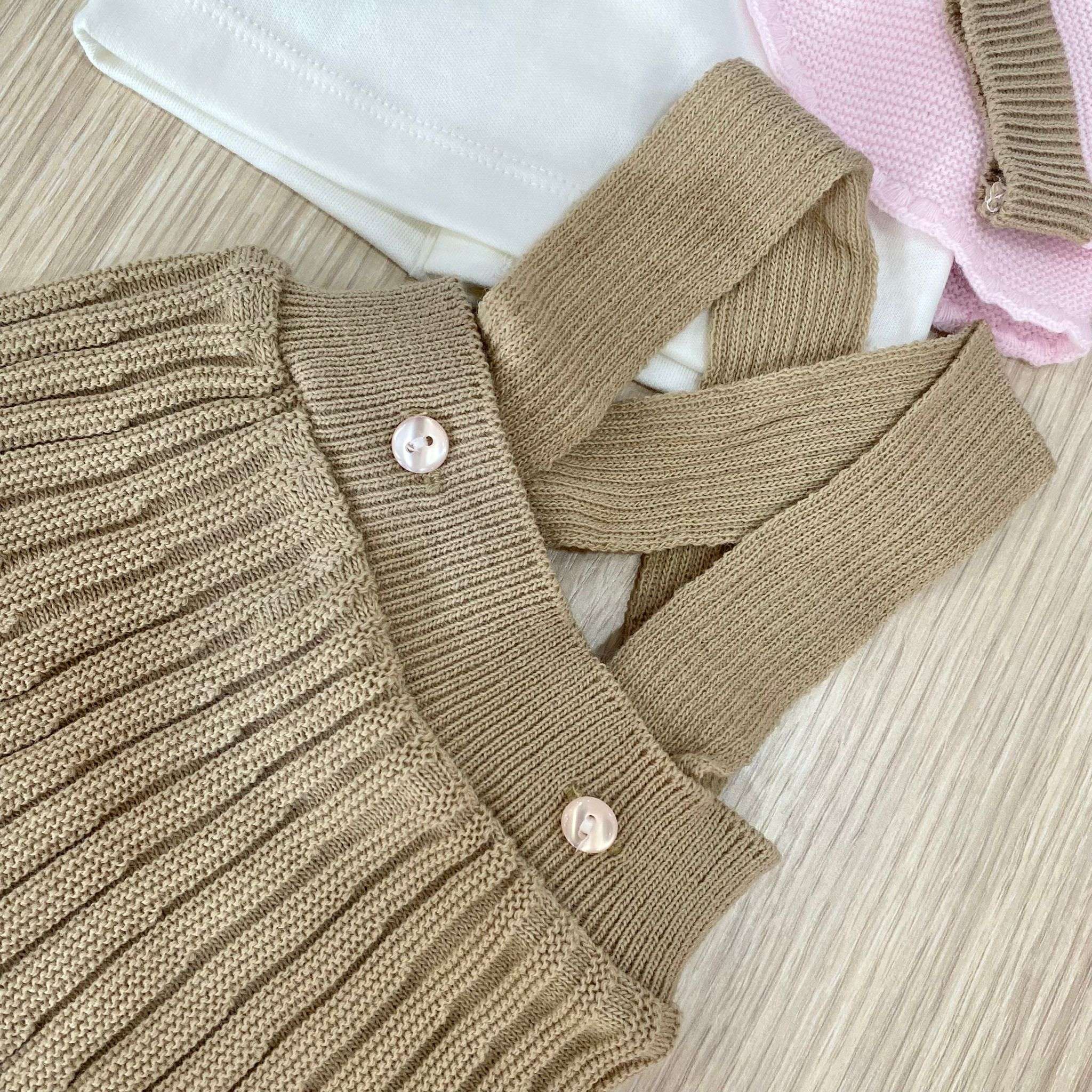 Salopette tre pezzi neonata in lana, di colore panna, corda e rosa.