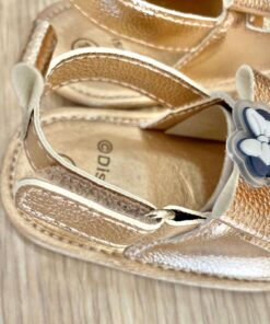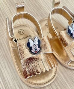 Sandalino dorato, con applicazione fiocchetto e Minnie gommata. Sandalino antiscivolo e chiusura a strappo.