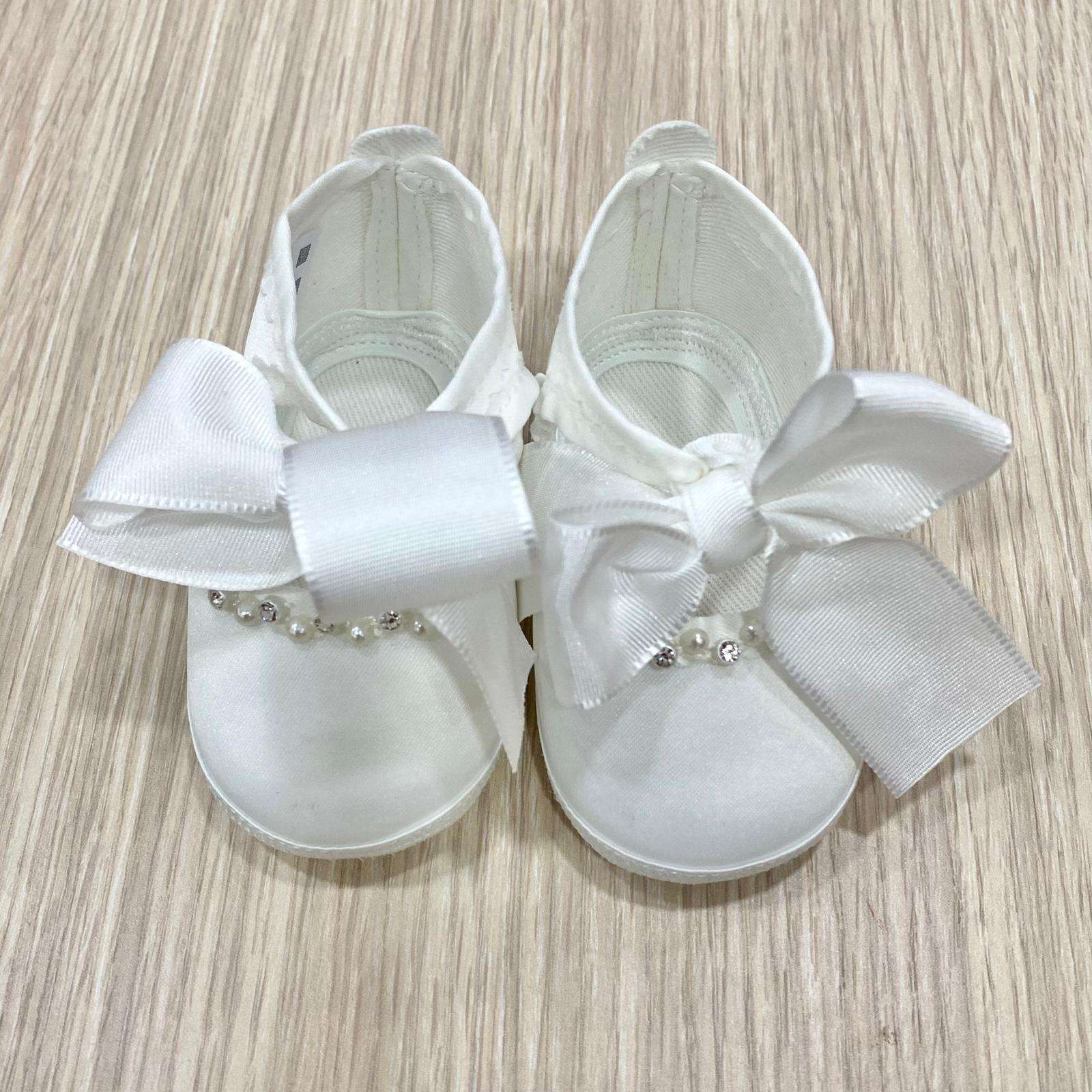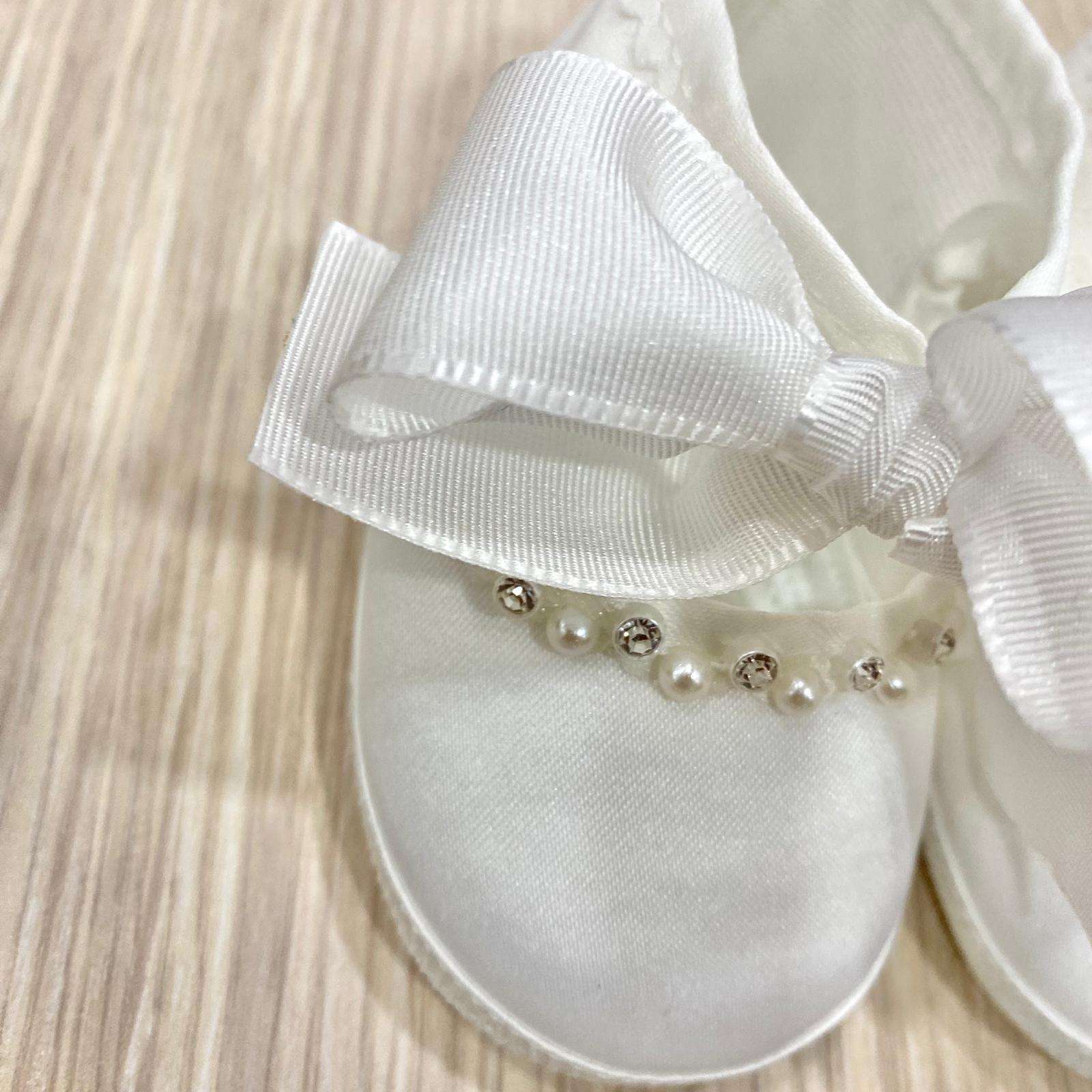 Scarpetta ballerina elegante in cotone rasato di colore latte, con applicazione di perline e swarovski. Chiusura con fiocchetto regolabile.