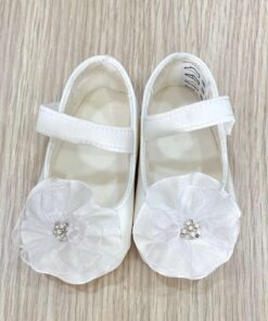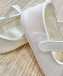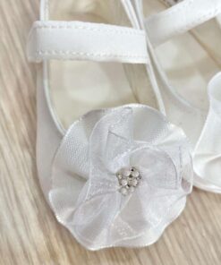 Scarpetta ballerina elegante in cotone rasato di colore latte, con applicazione di perline e swarovski. Chiusura a strappo.
