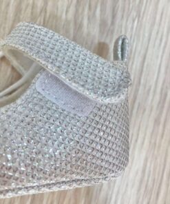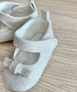 Scarpette ballerina con interno in cotone, con nido d’api argentato, applicazione di fiocchetto. Scarpetta con chiusura a strappo.