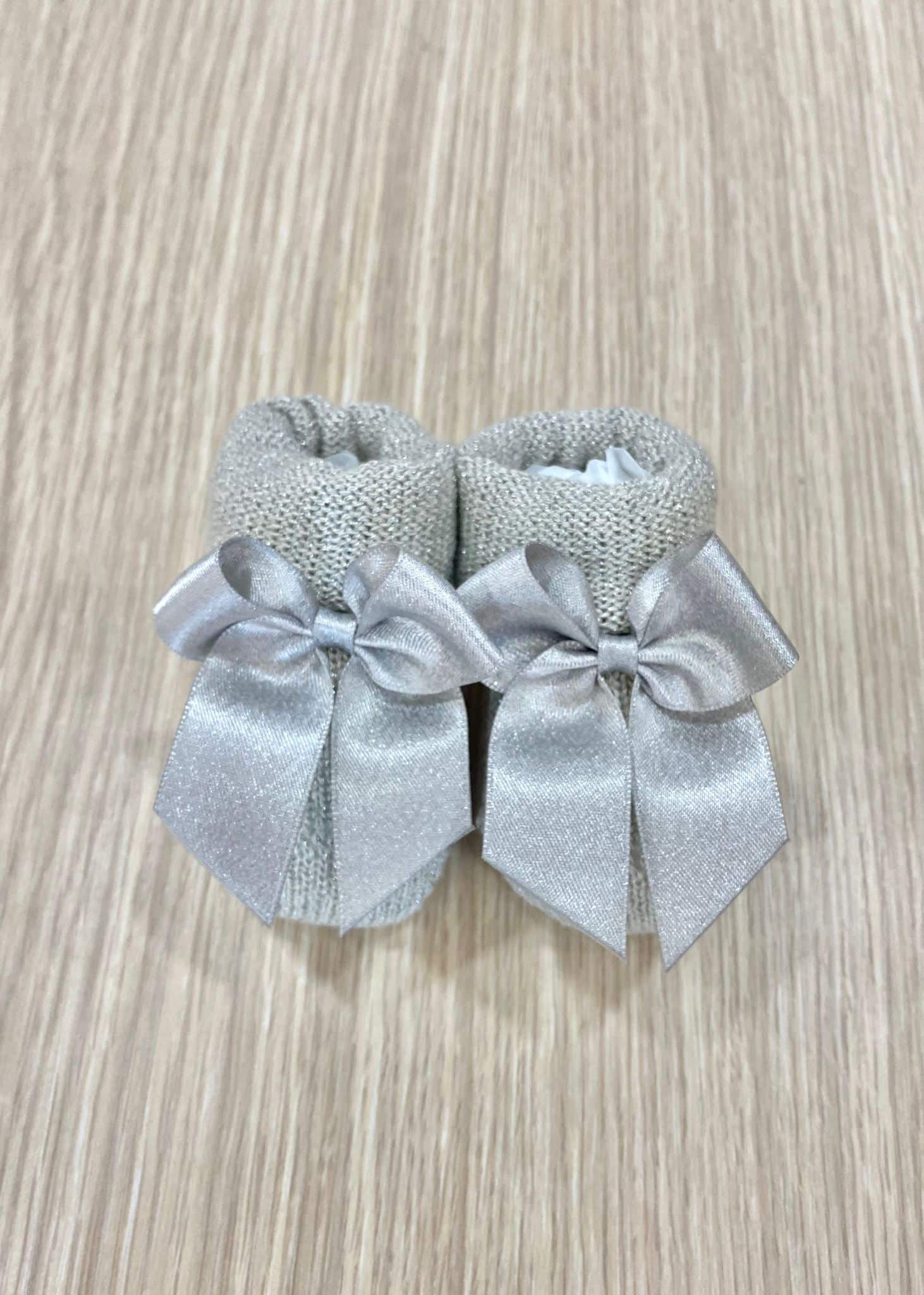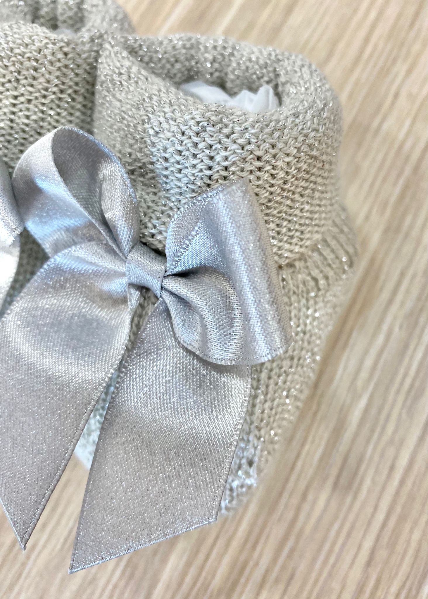 Scarpine/calzino neonata, in caldo cotone, di colore argento, con dettagli in lurex e applicazione di fiocchetto.