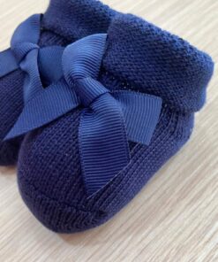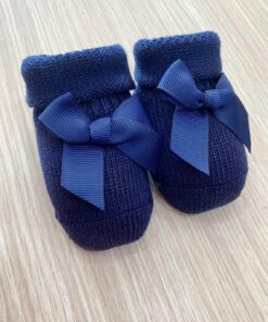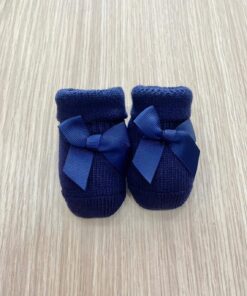 Calzino neonata in caldo cotone, di colore blu con applicazione di fiocco.