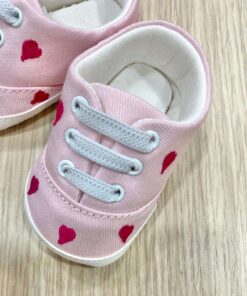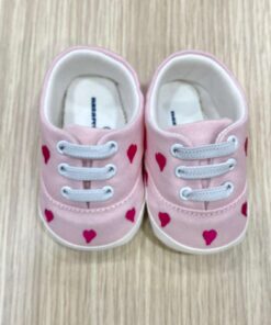 Scarpine neonata/bambina in cotone, di colore rosa, con ricami fucsia, con dettaglio di elastico regolabile.