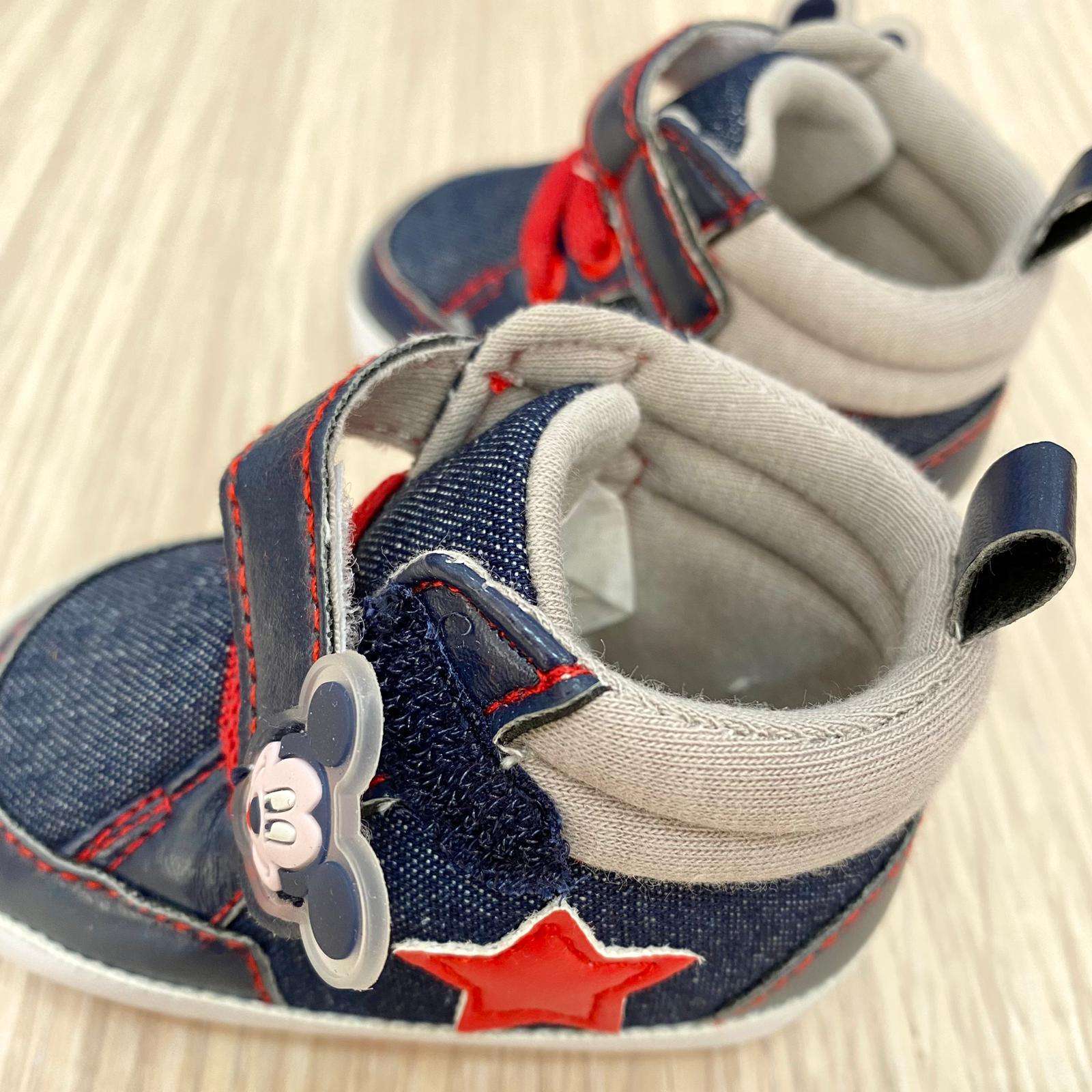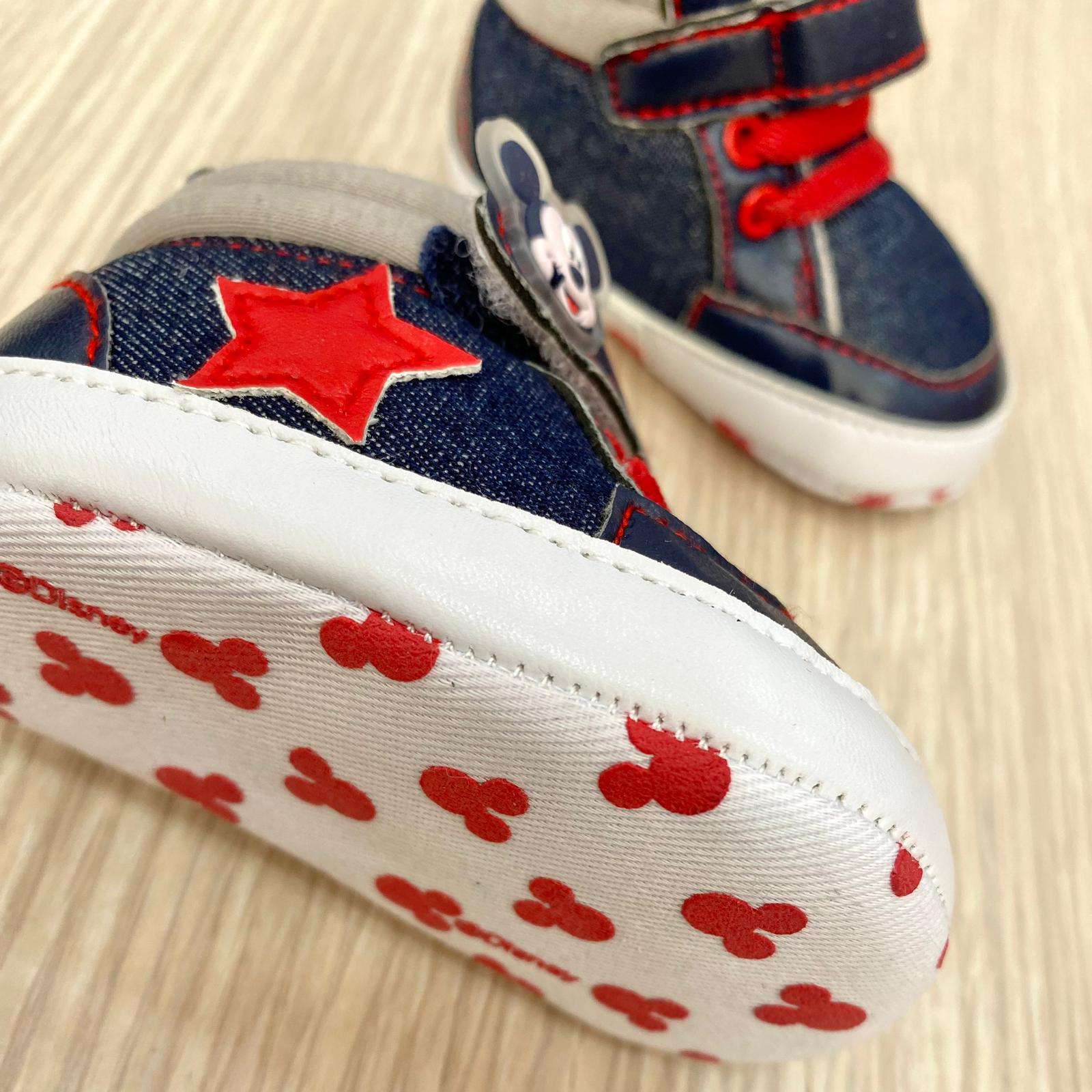 Scarpine neonato/bambino in denim, con dettaglio di Mickey Mouse gommato. Scarpine antiscivolo e chiusura a strappo.