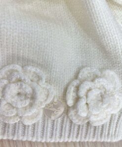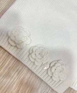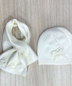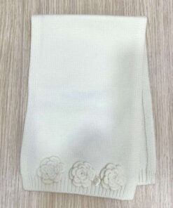 Sciarpa neonata/bambina in caldo tessuto, di colore burro, con applicazione di fiorellini e fiocchetto in tessuto.