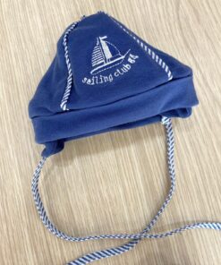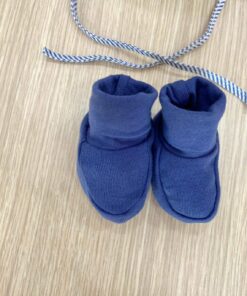 Set cappellino e babbucce neonato in cotone primaverile/estivo di colore blu con dettagli in bianco.