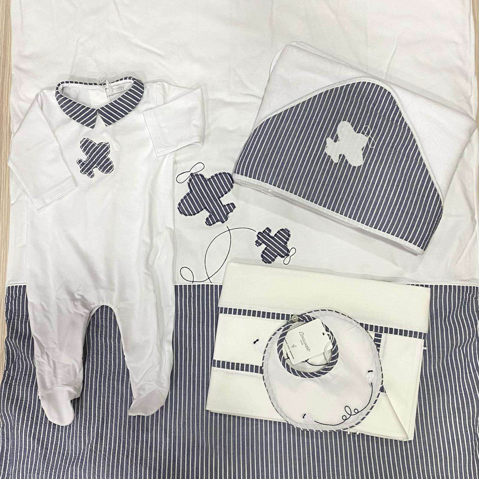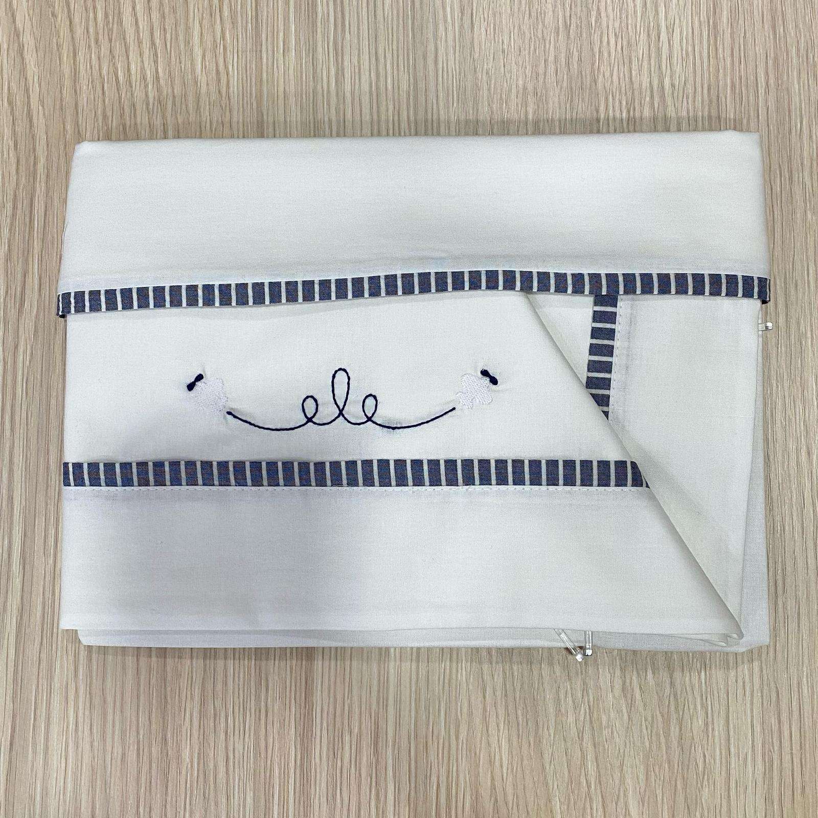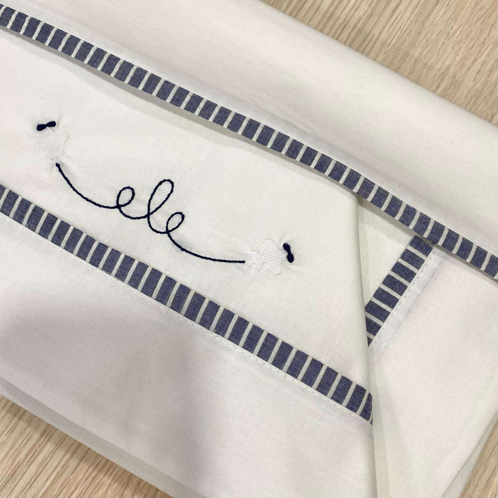 Set lenzuolino culla/carrozzina in cotone, di colore bianco e blu navy con disegno ricamo.
