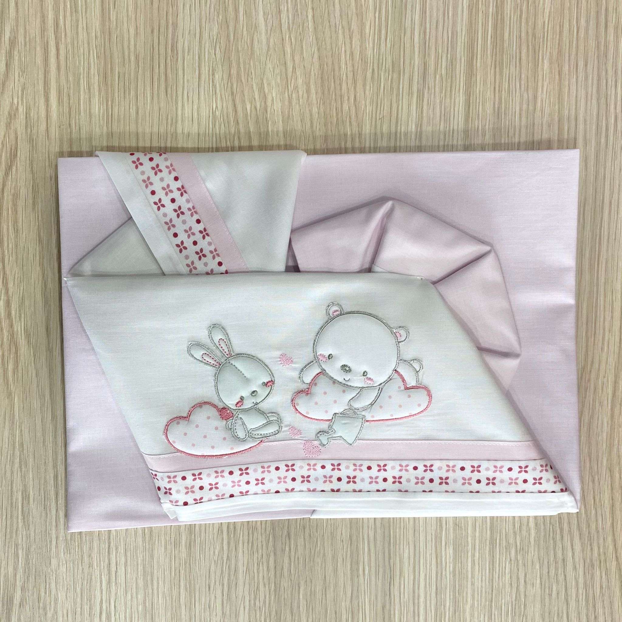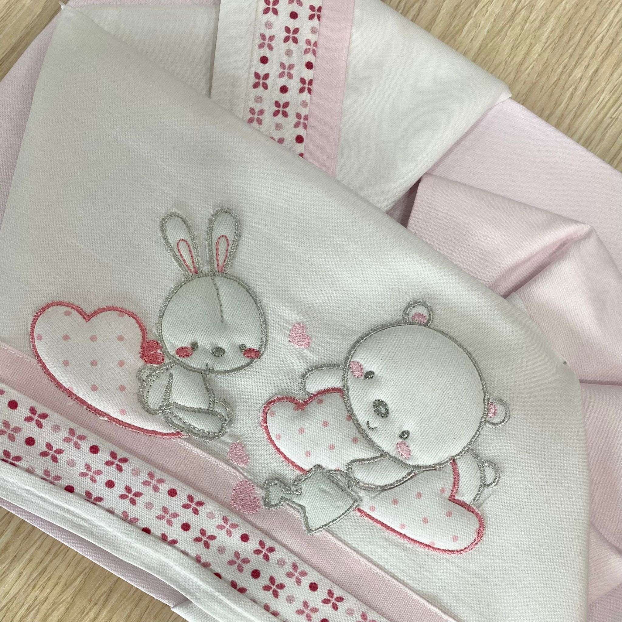 Set lenzuolino culla/carrozzina neonata in cotone, di colore rosa e bianco, con disegno in rilievo.