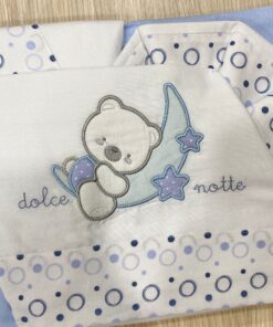 Set lenzuolino culla/carrozzina neonato in cotone, di colore bianco e azzurro, con disegno in rilievo.