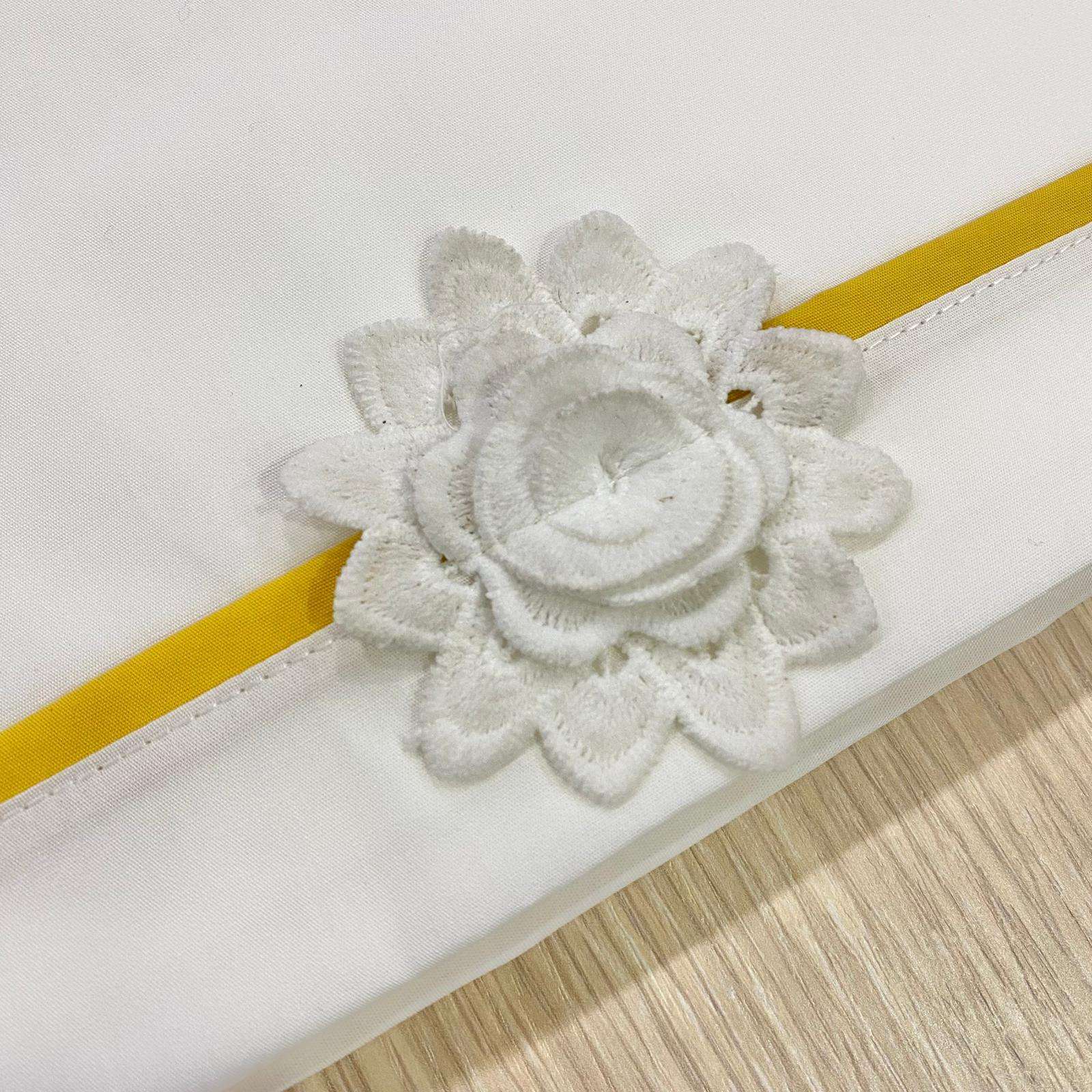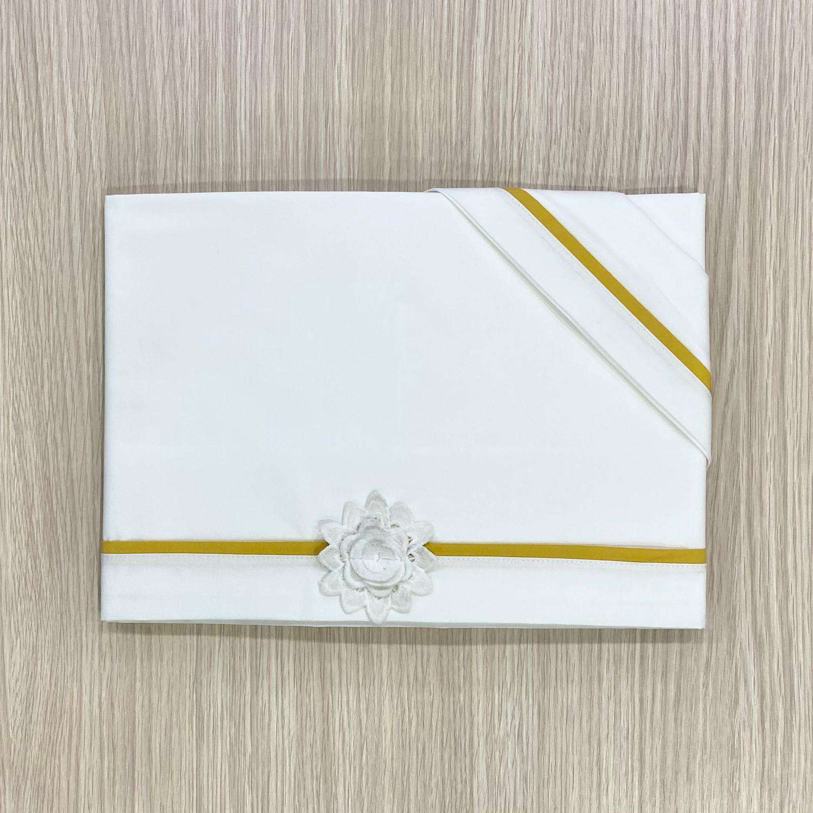 Set lenzuolino culla/carrozzina neonata in cotone, di colore panna e senape, con applicazione di fiorellino in pizzo sangallo.