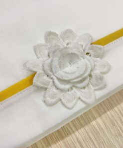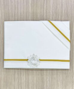 Set lenzuolino culla/carrozzina neonata in cotone, di colore panna e senape, con applicazione di fiorellino in pizzo sangallo.