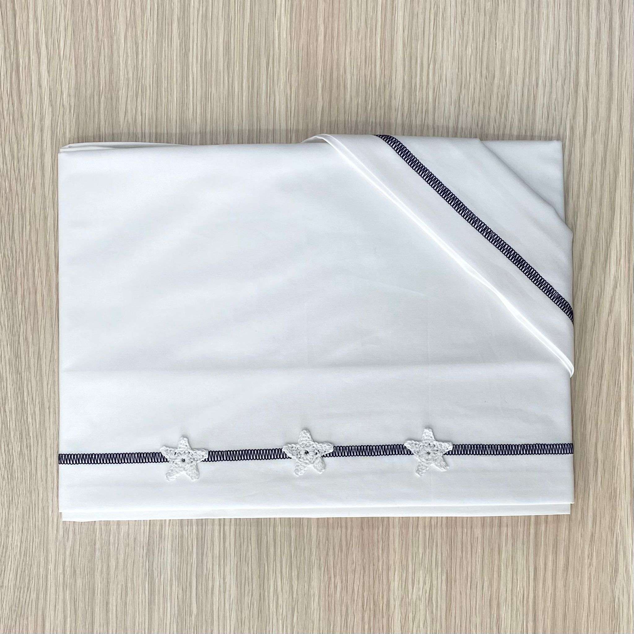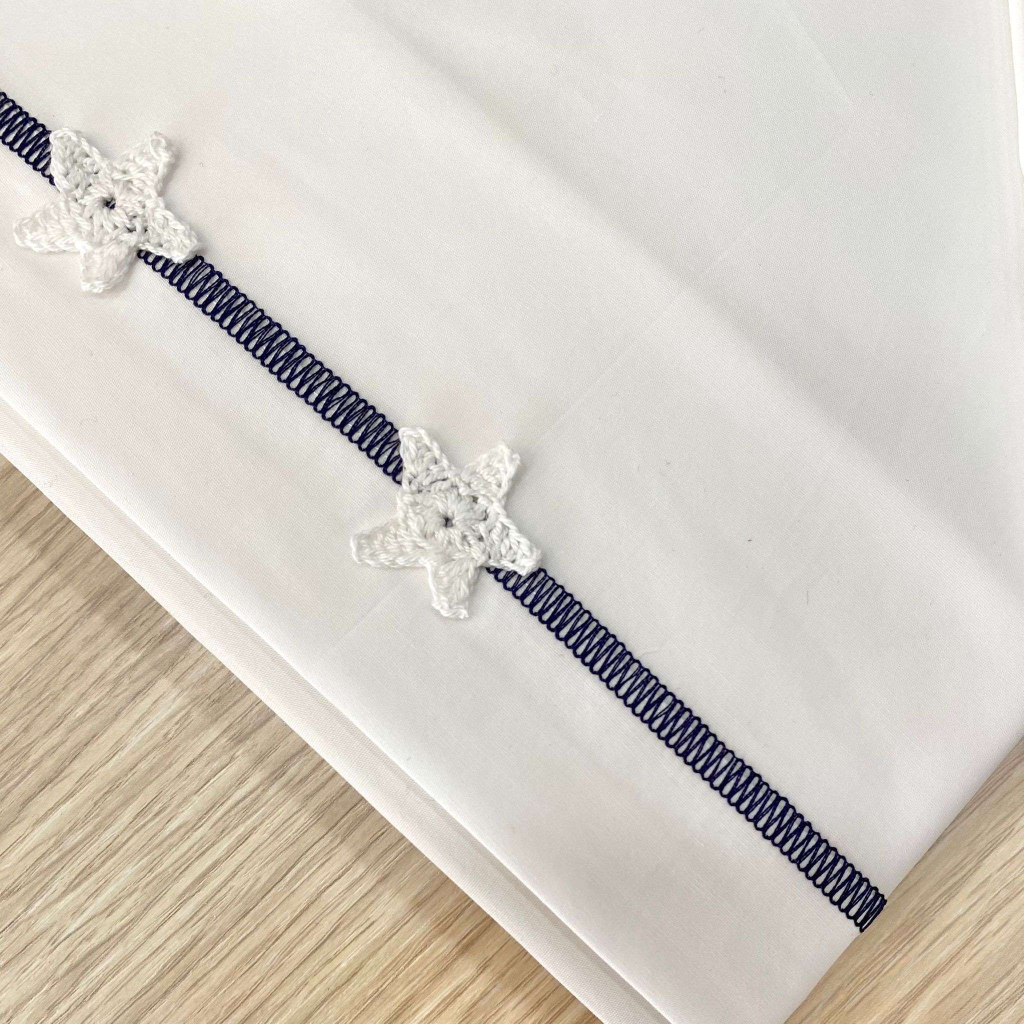 Set lenzuolino culla/carrozzina in cotone, di colore bianco e bluette, con applicazione di stelle marine in tessuto.