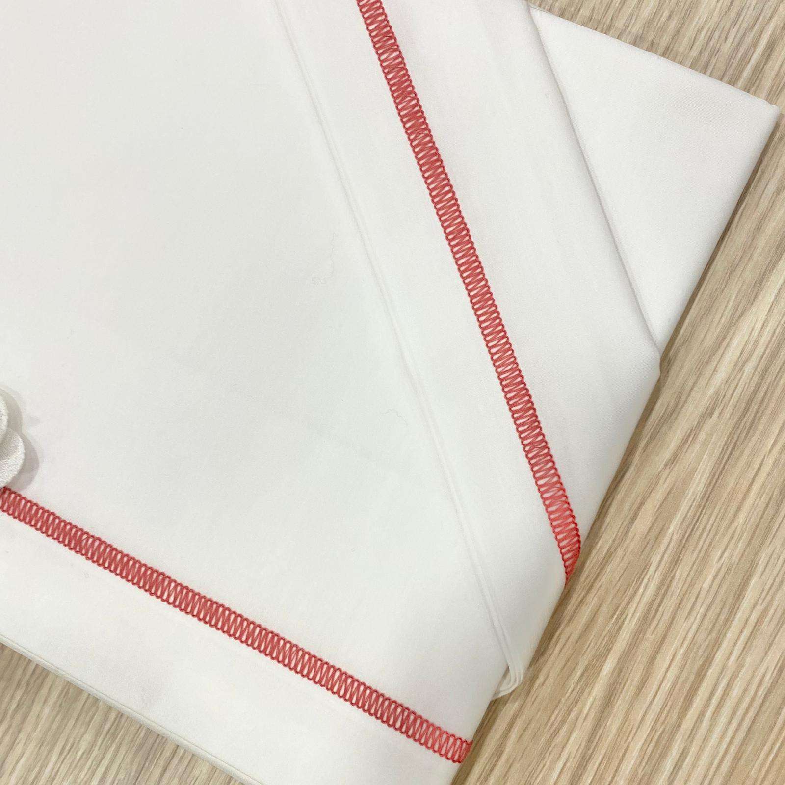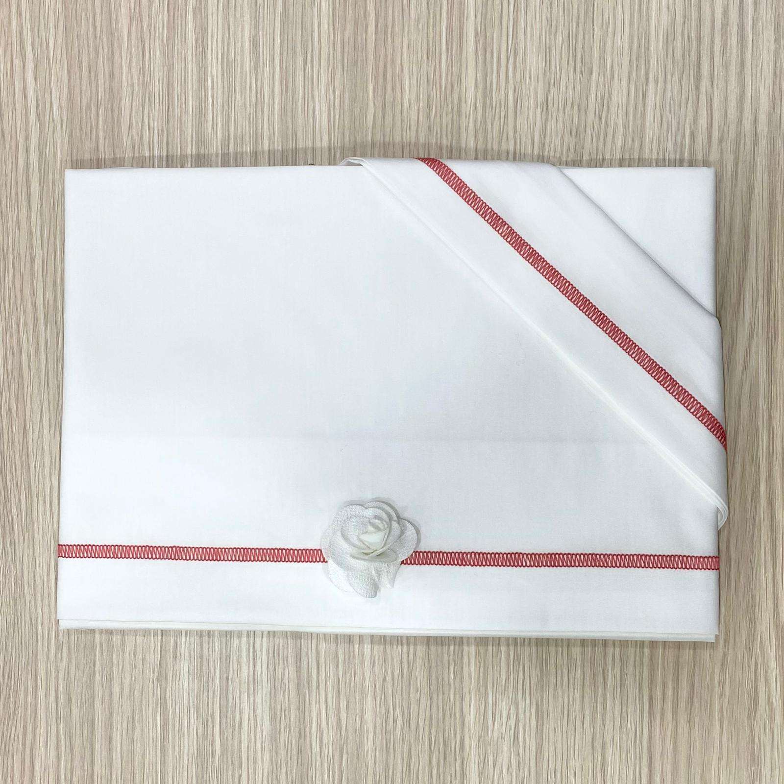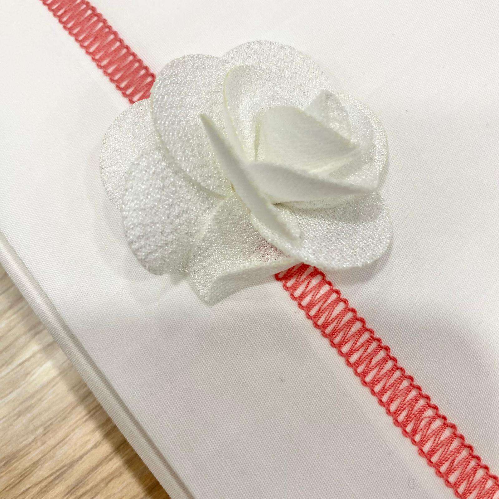 Set lenzuolino culla/carrozzina neonata in cotone, di colore bianco e geranio, con applicazione di fiorellino in tessuto.