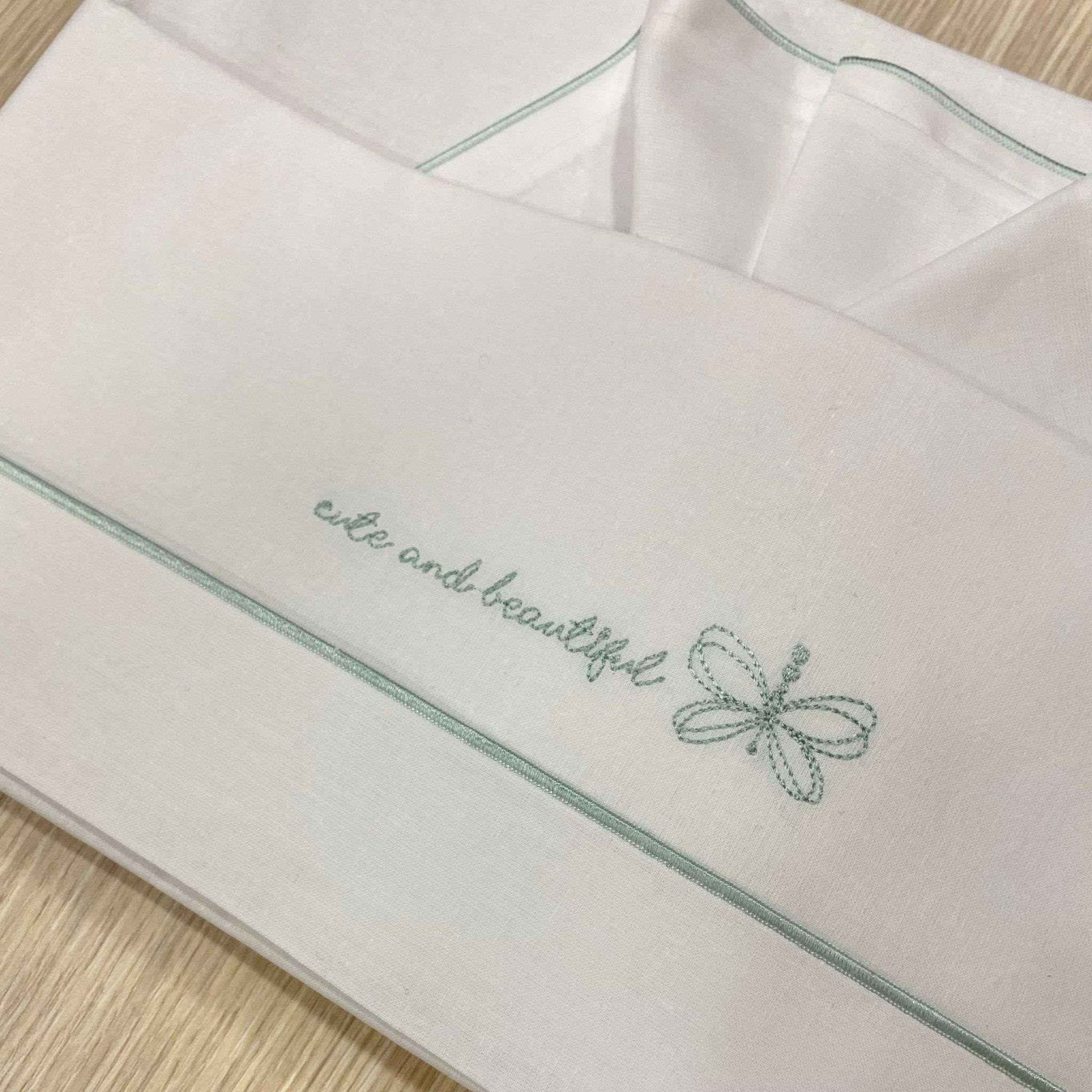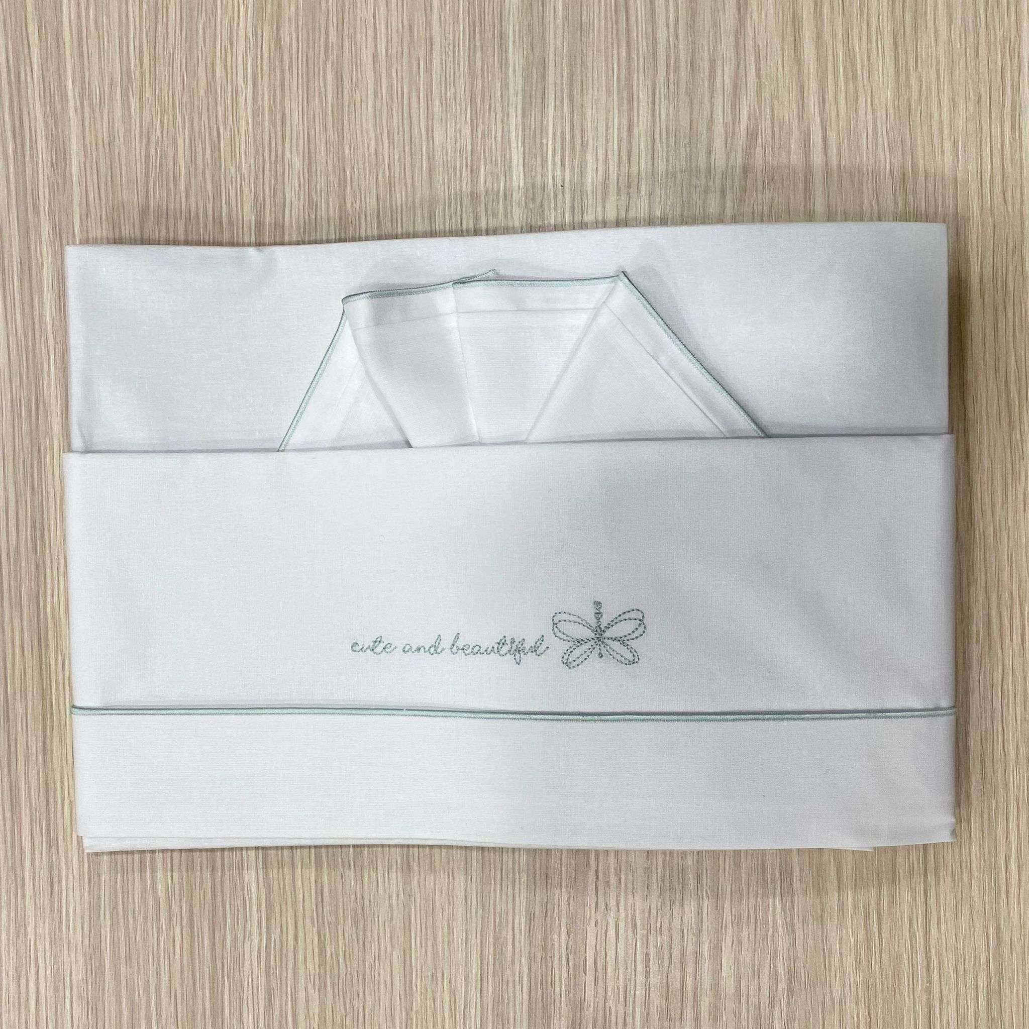 Set lenzuolino culla/carrozzina neonata bianco con dettaglio e scritta ricamata di colore verde.
