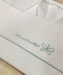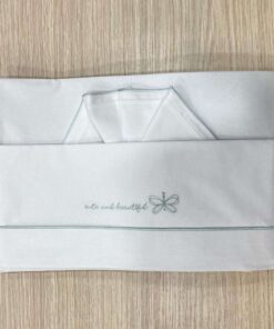 Set lenzuolino culla/carrozzina neonata bianco con dettaglio e scritta ricamata di colore verde.