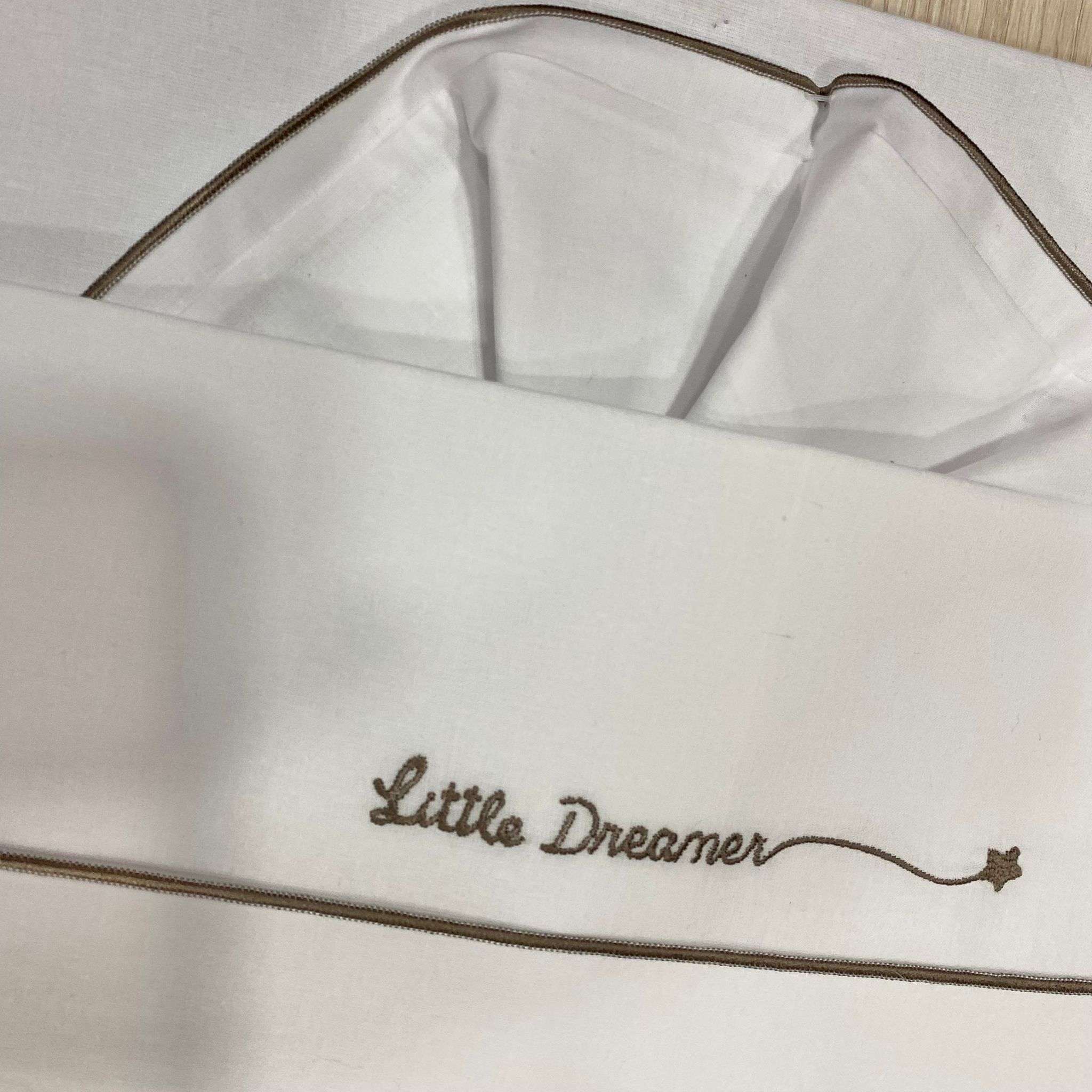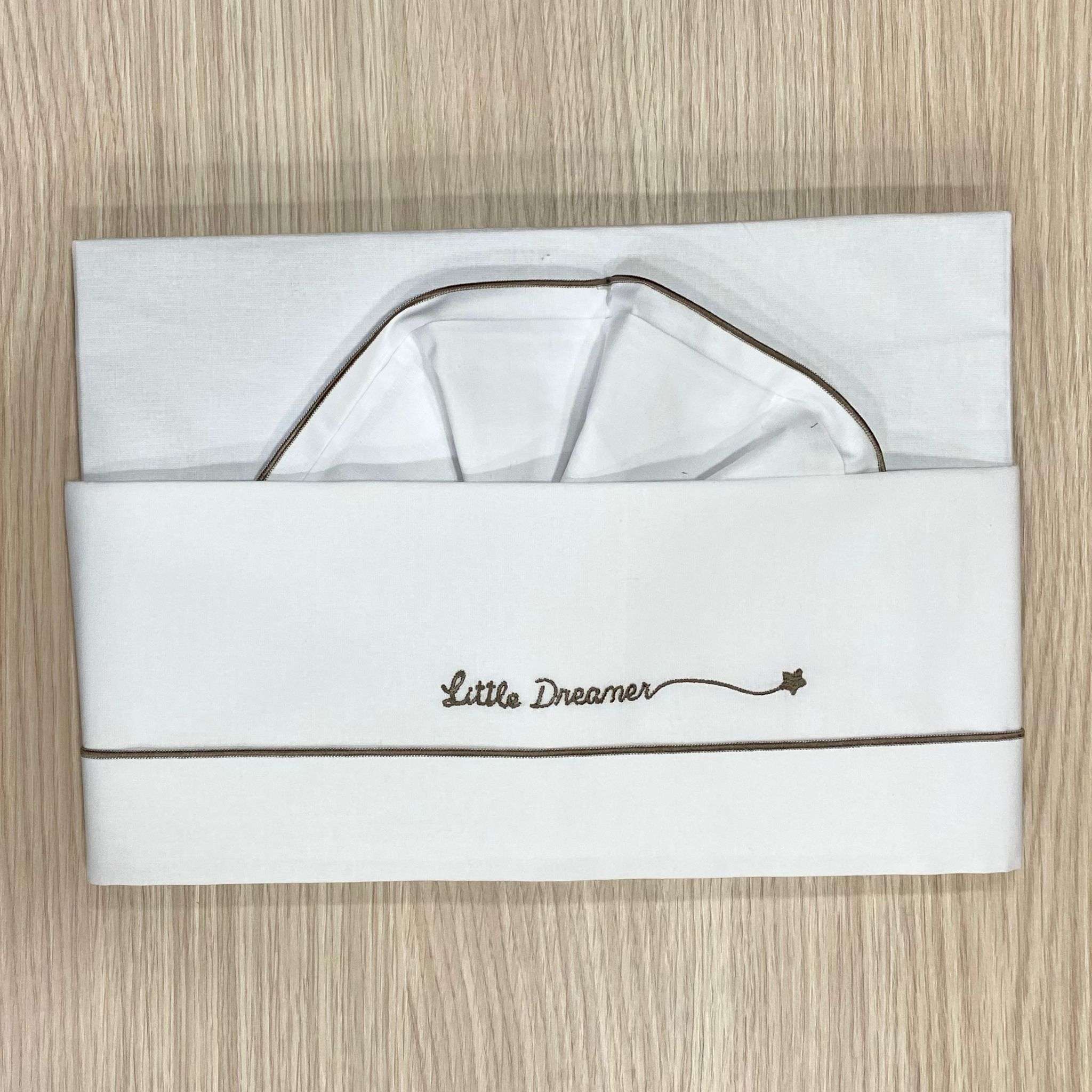 Set lenzuolino culla/carrozzina neonato in cotone, di colore bianco e beige, con scritta e disegno ricamato.