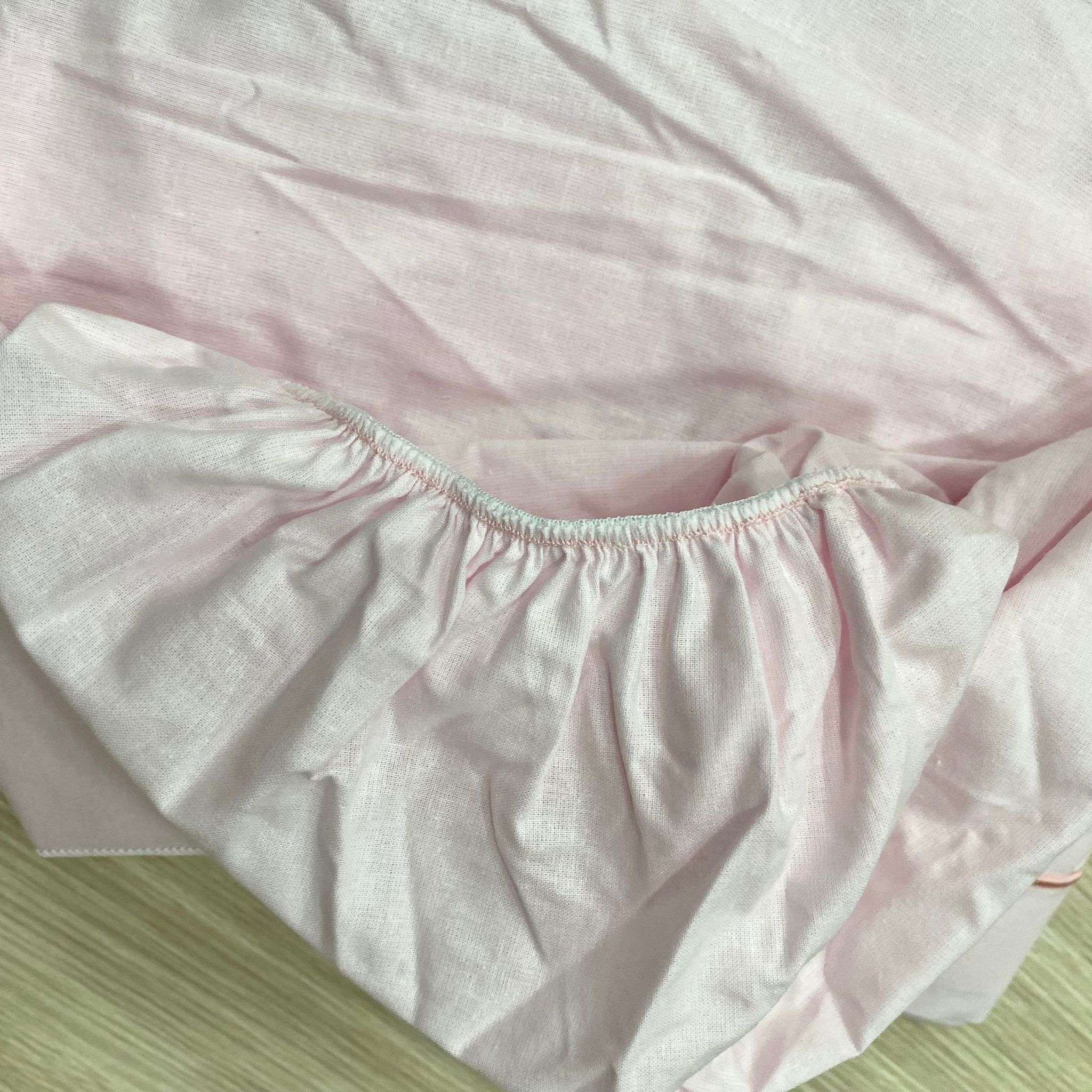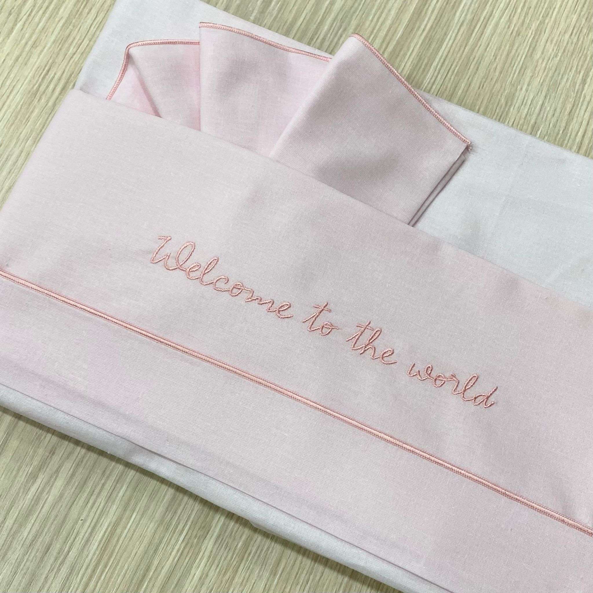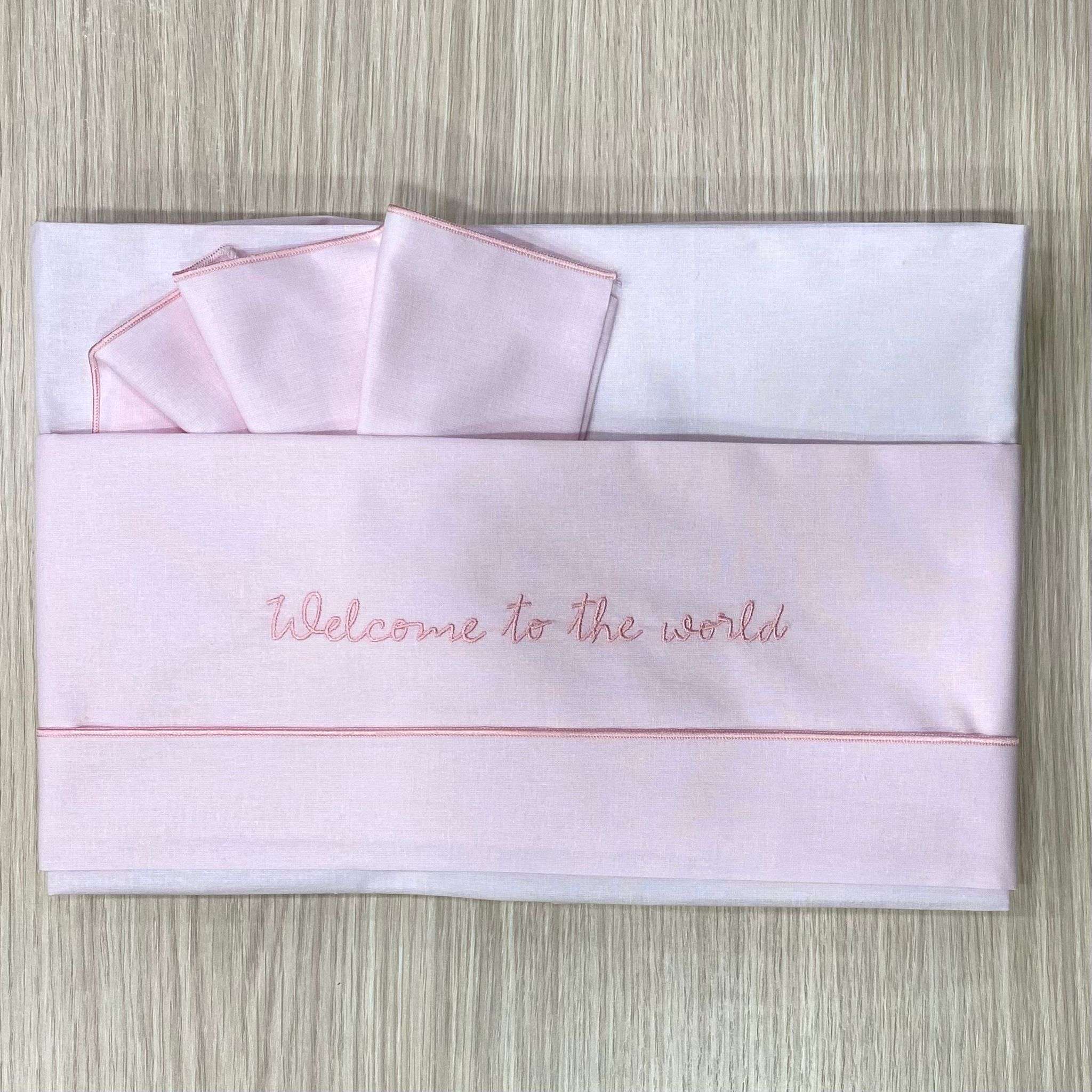 Set lenzuolino culla/carrozzina neonata in cotone, di colore rosa, con scritta ricamata “WELCOME TO THE WORLD”.