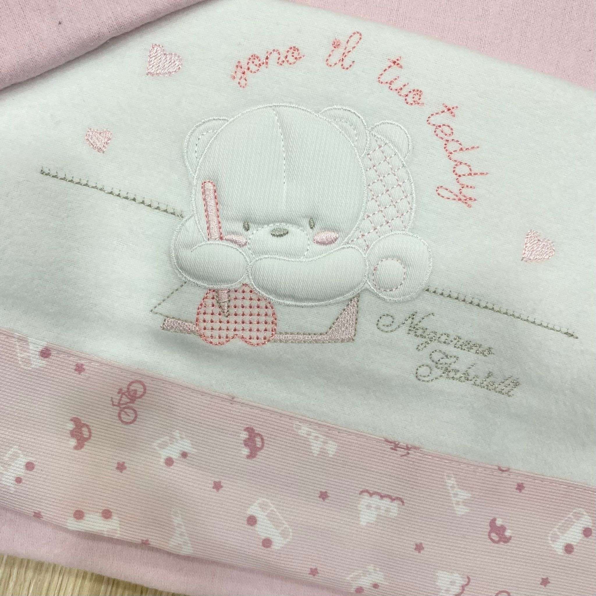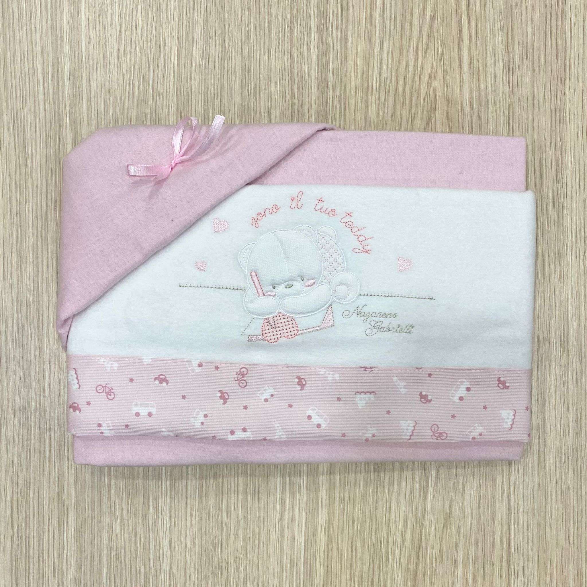 Set lenzuolino culla/carrozzina neonata in flanella, di colore bianco e rosa, con scritta e disegno ricamato.