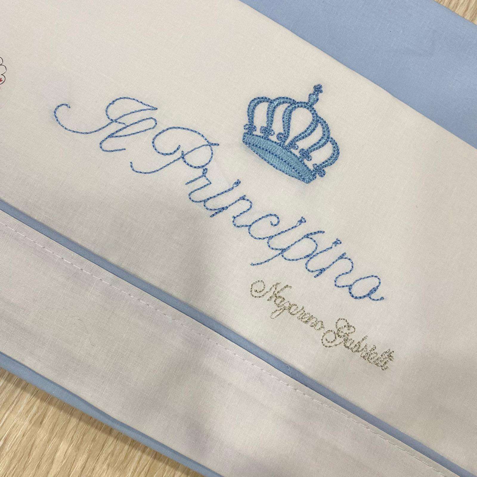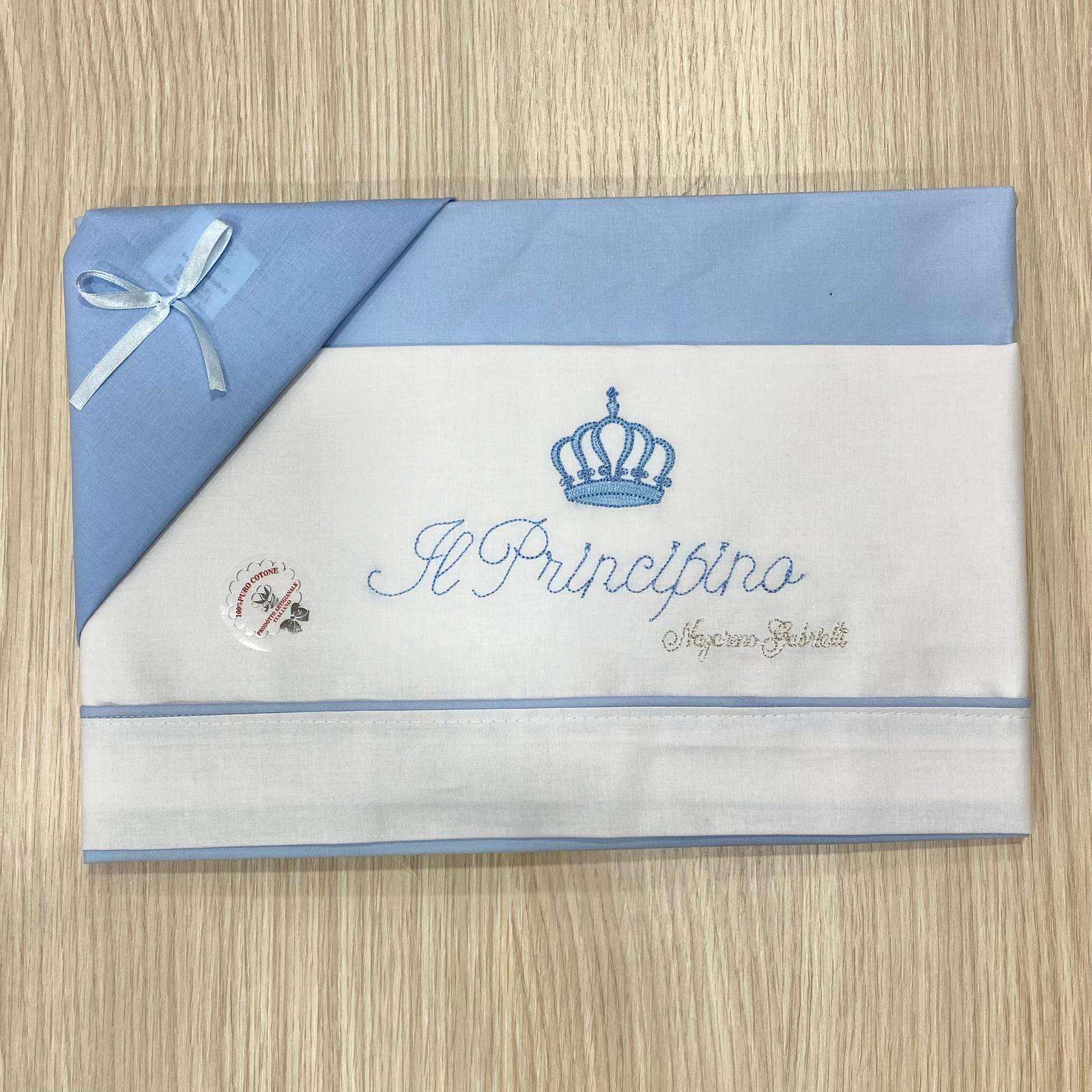 Composè culla/carrozzina neonato in cotone, di colore bianco e azzurro, con scritta ricamata “Il Principino”.