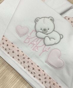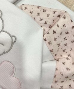 Set lenzuolino culla/carrozzina neonata in cotone, di colore bianco e rosa con disegno in rilievo.
