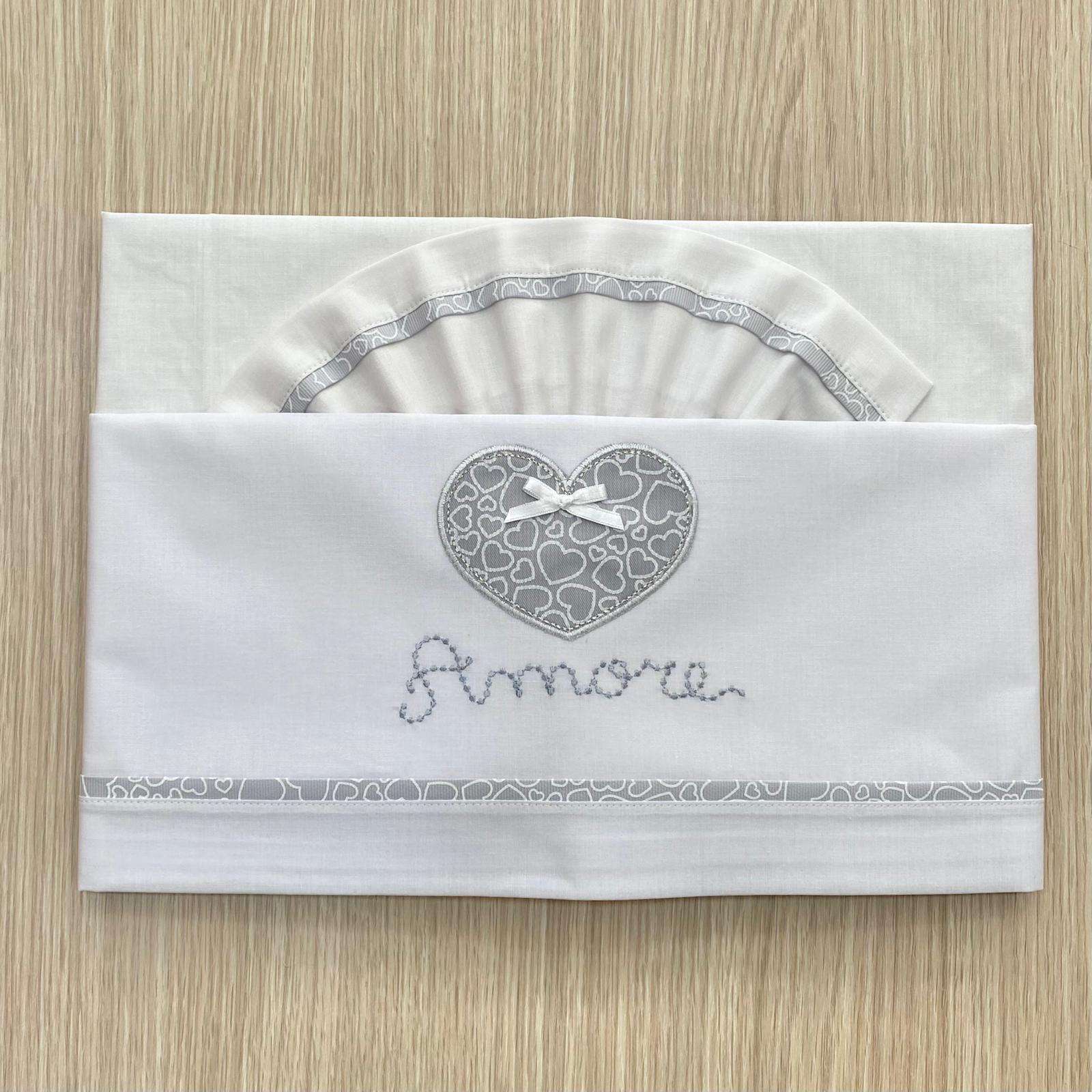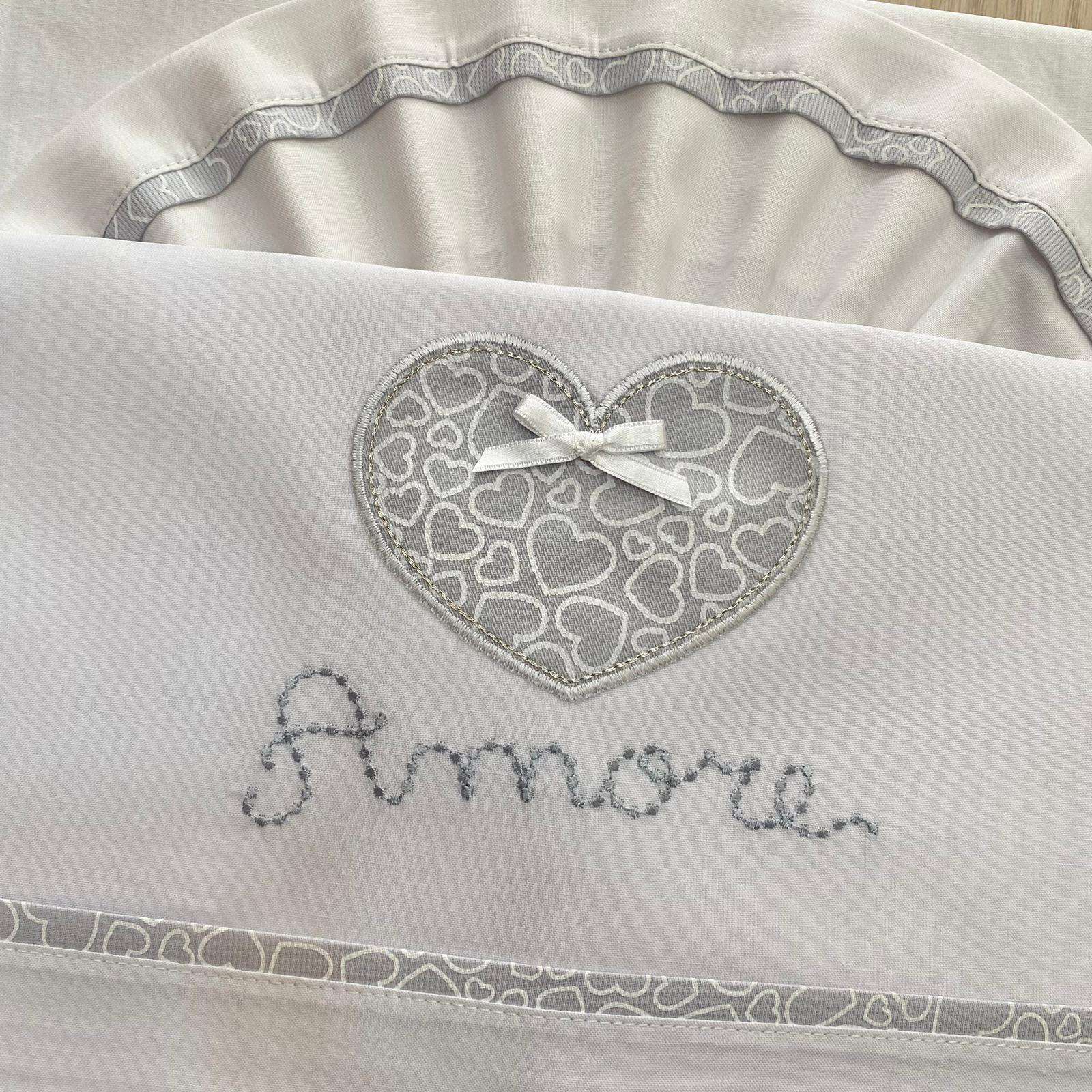 Set lenzuolino culla/carrozzina neonato/a in cotone, di colore panna e grigio con disegno e scritta ricamata.
