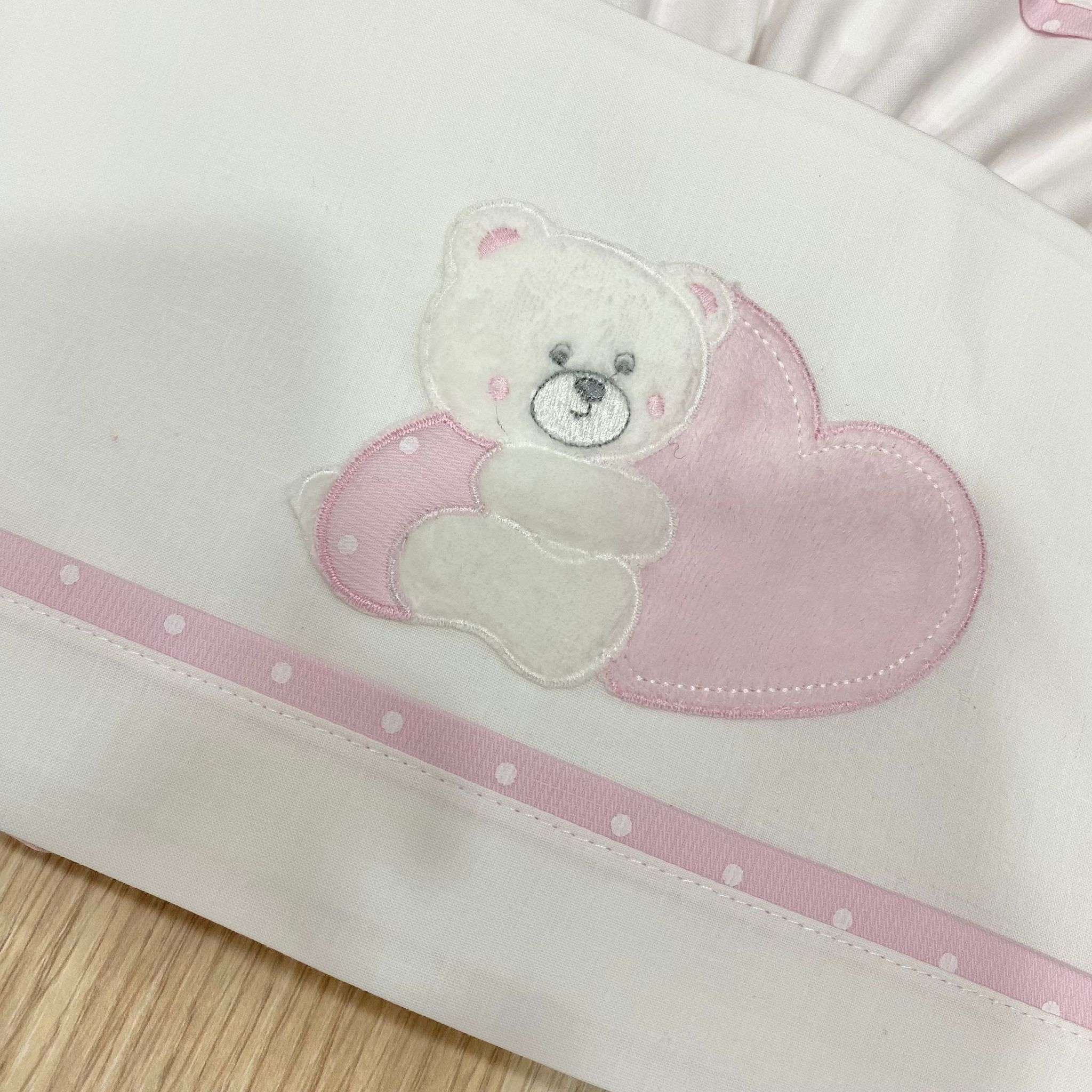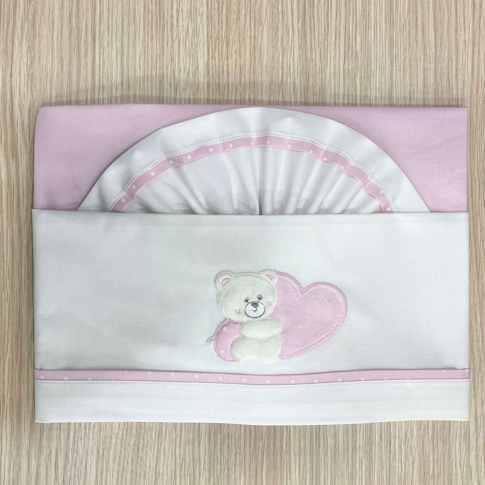 Set lenzuolino culla/carrozzina neonata in cotone, di colore bianco e rosa con disegno in rilievo.