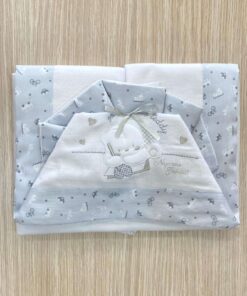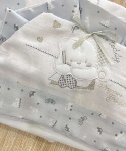 Set lenzuolino lettino/culla grande neonato/a in flanella, di colore bianco e grigio, con scritta e disegno ricamato.
