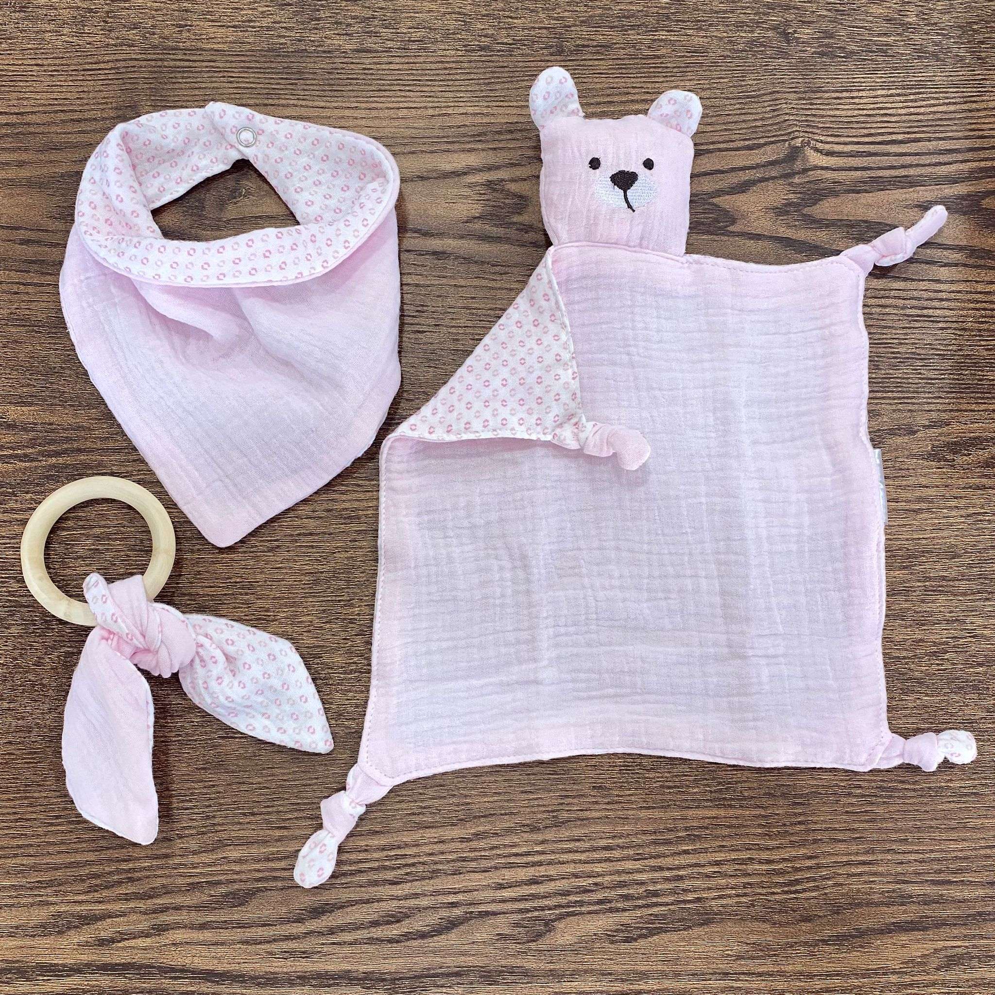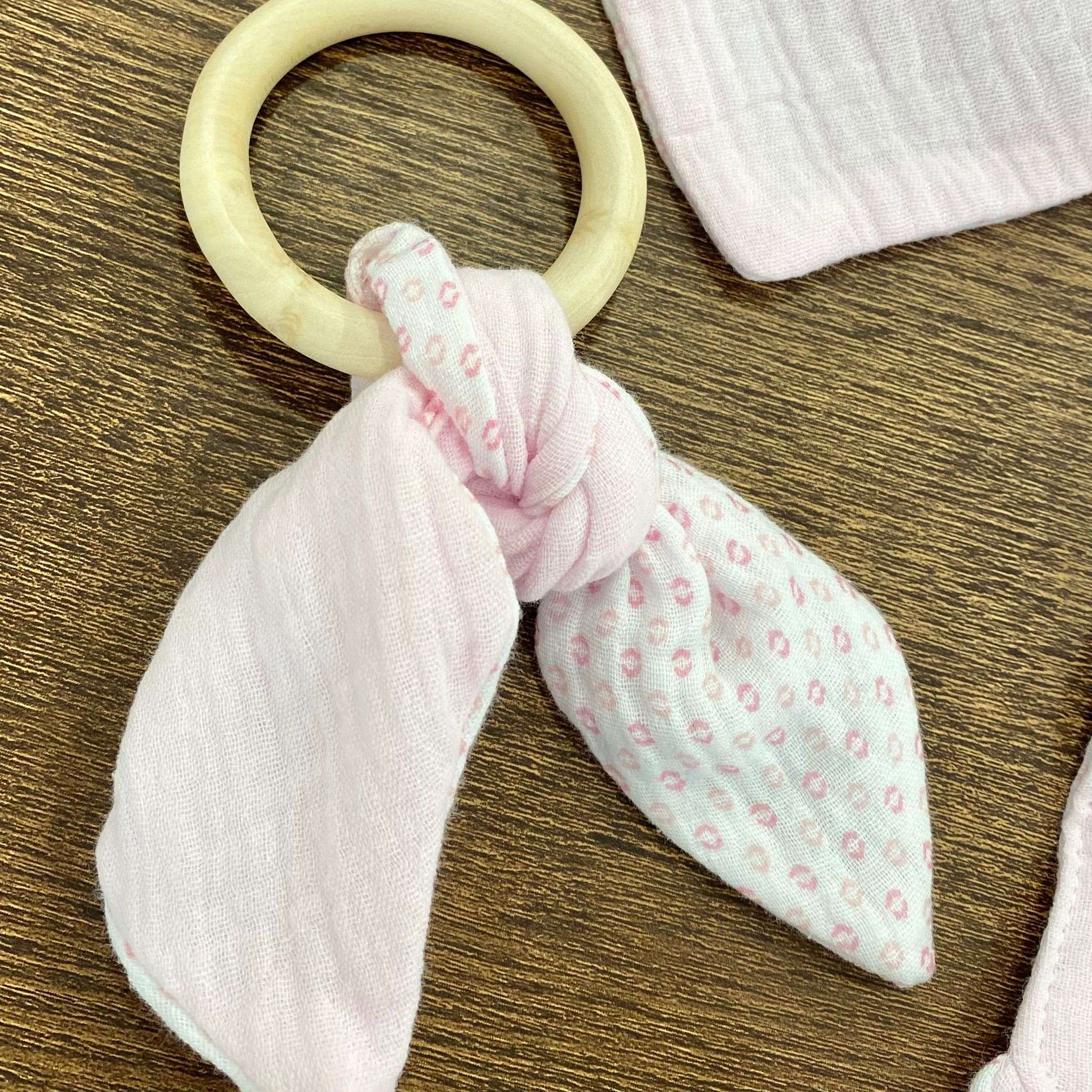 Dou dou e bavaglino in garza di puro cotone, accessorio per dentizione in legno naturale e garza di cotone.