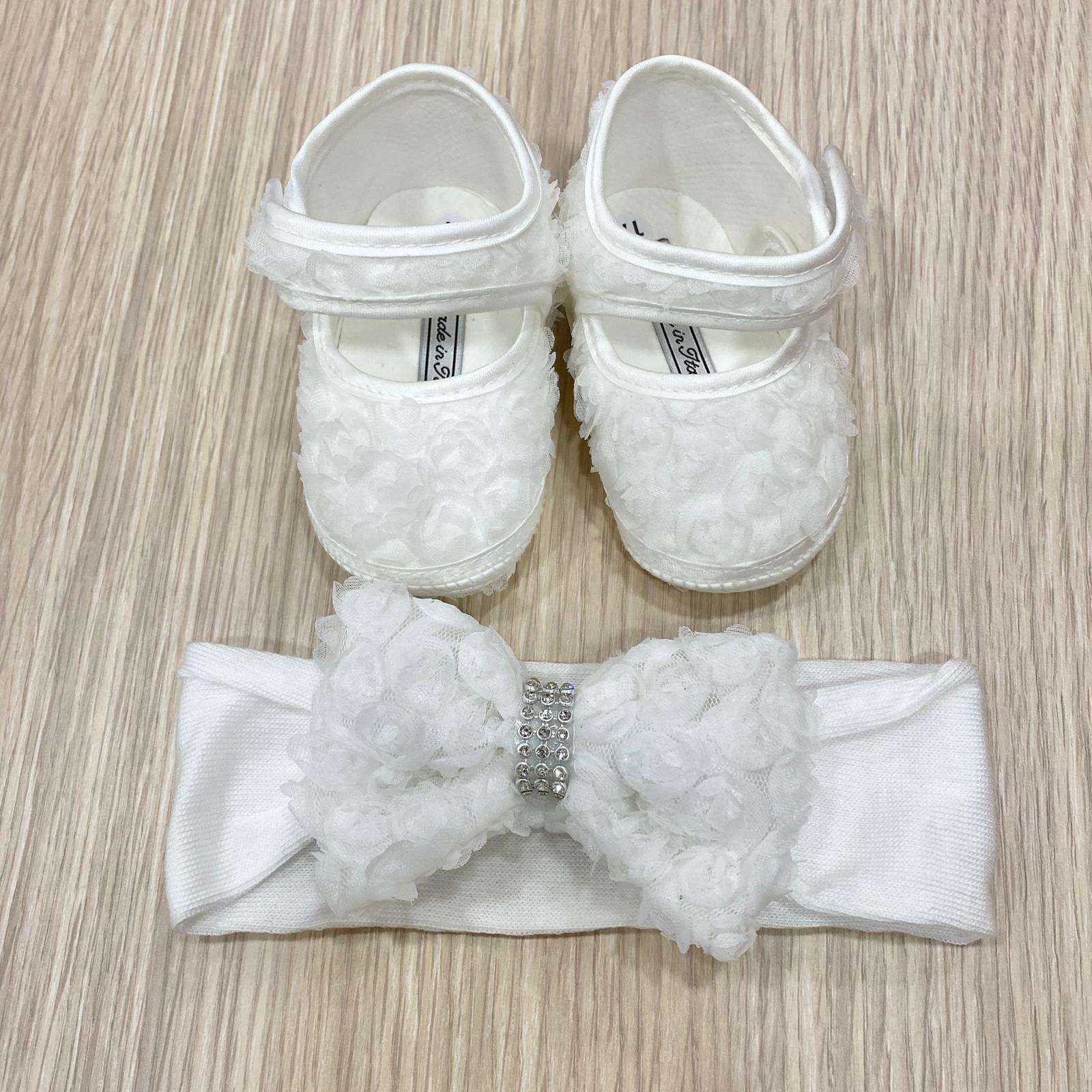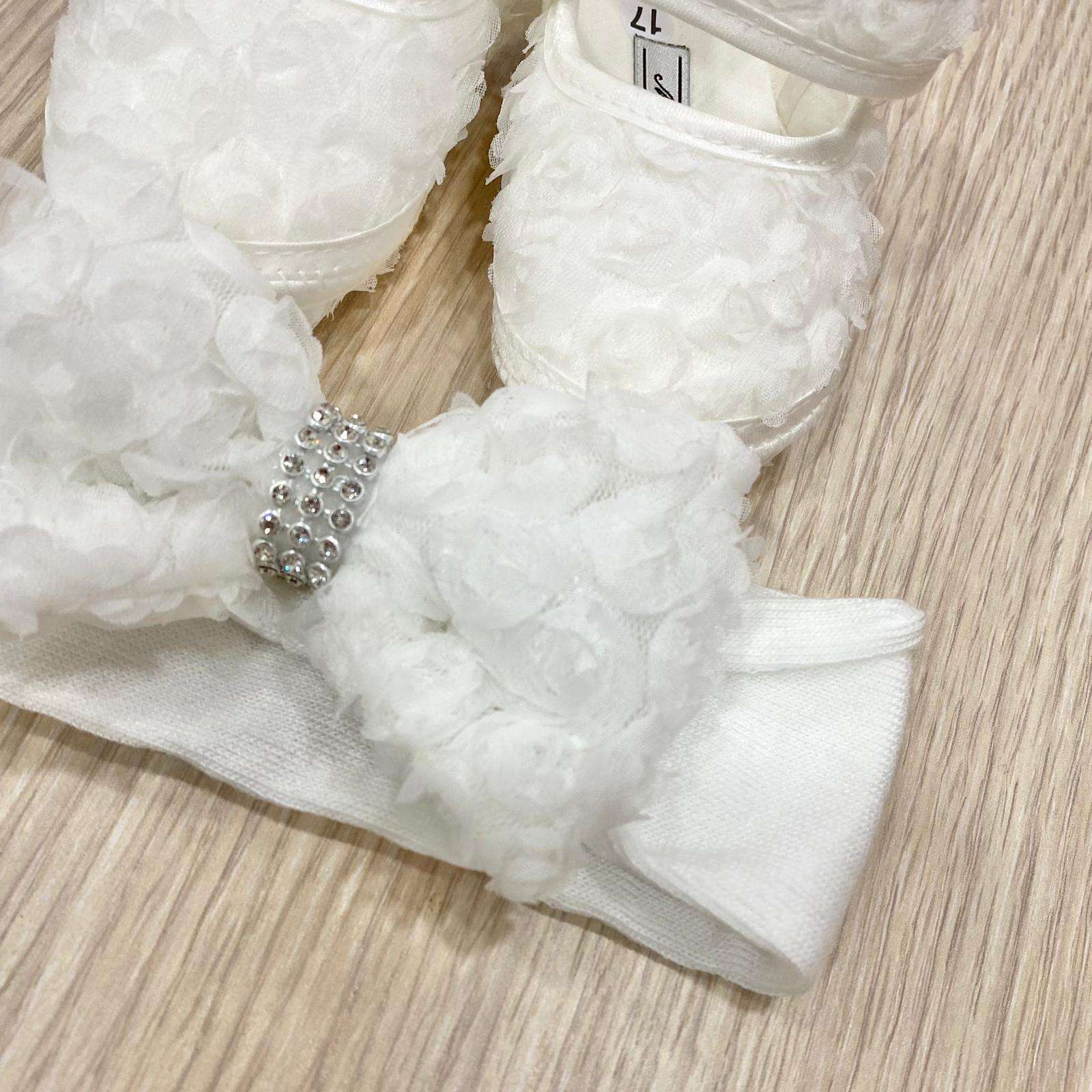 Set scarpine ballerina e fascetta neonata/bambina di colore avrio, con applicazione di swarovski, e fiorellini in tulle.