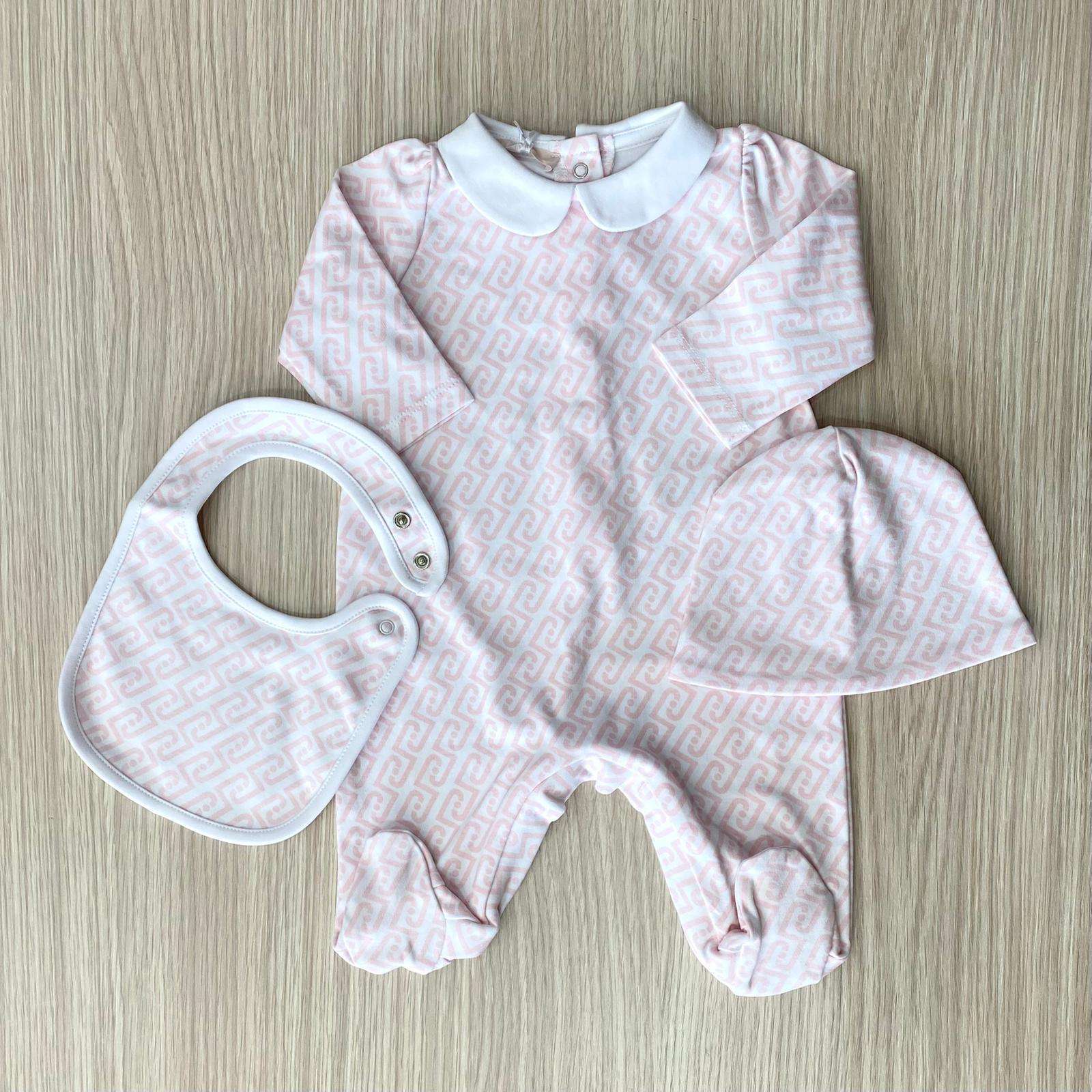 Tutina intera neonata in cotone, di colore bianco, con logo LIU•JO di colore rosa.