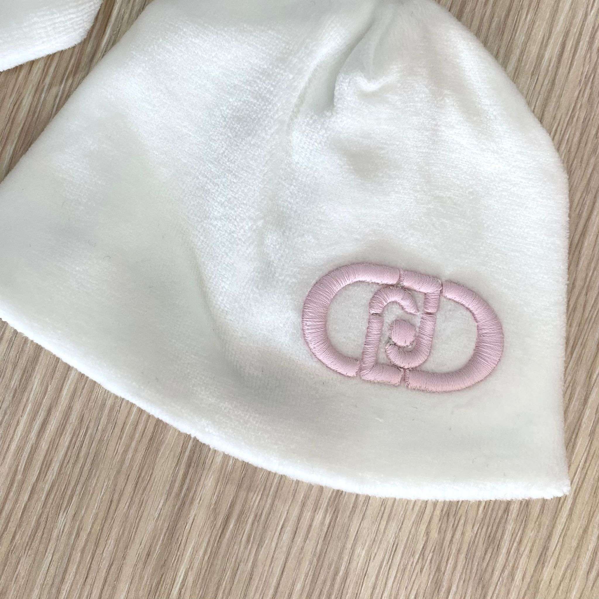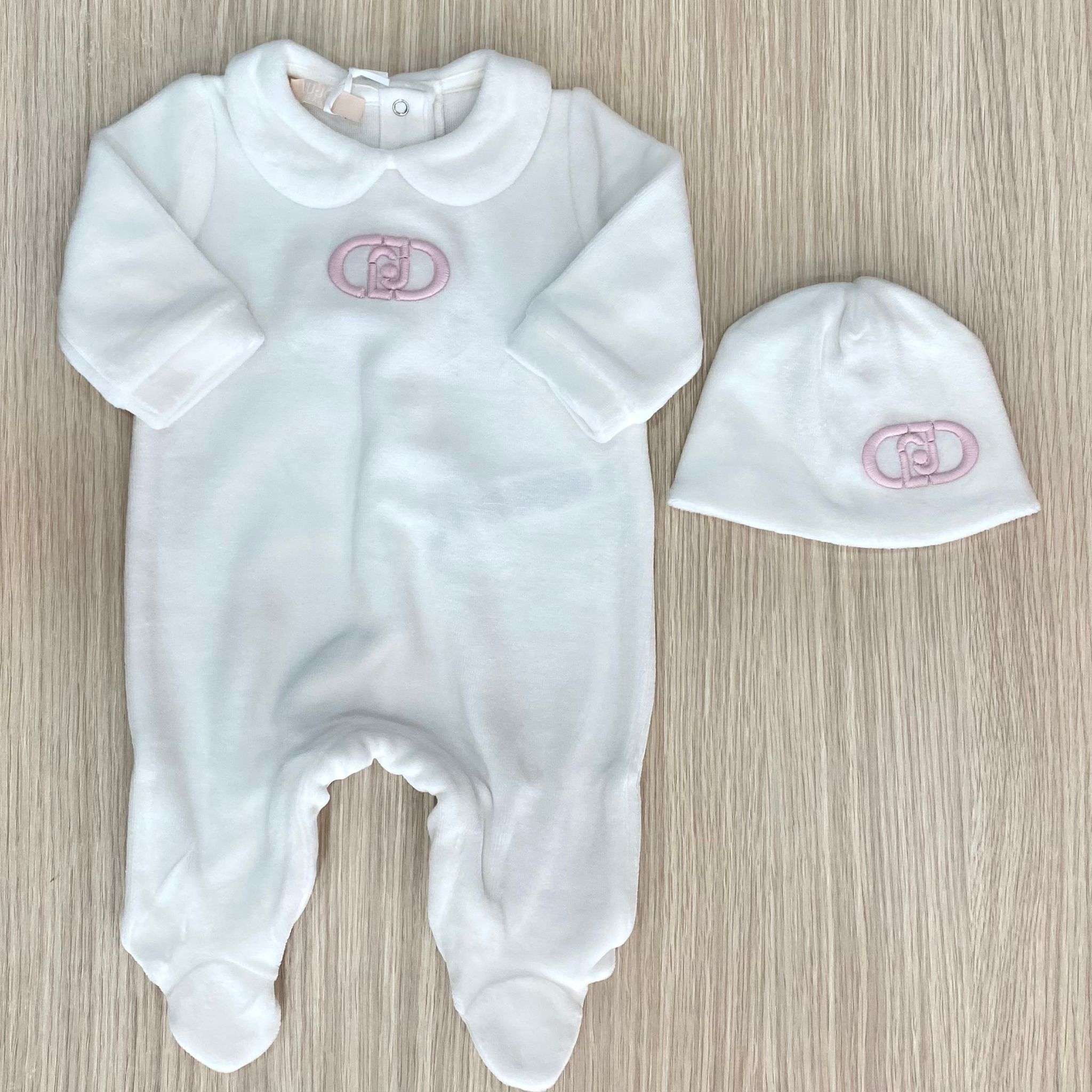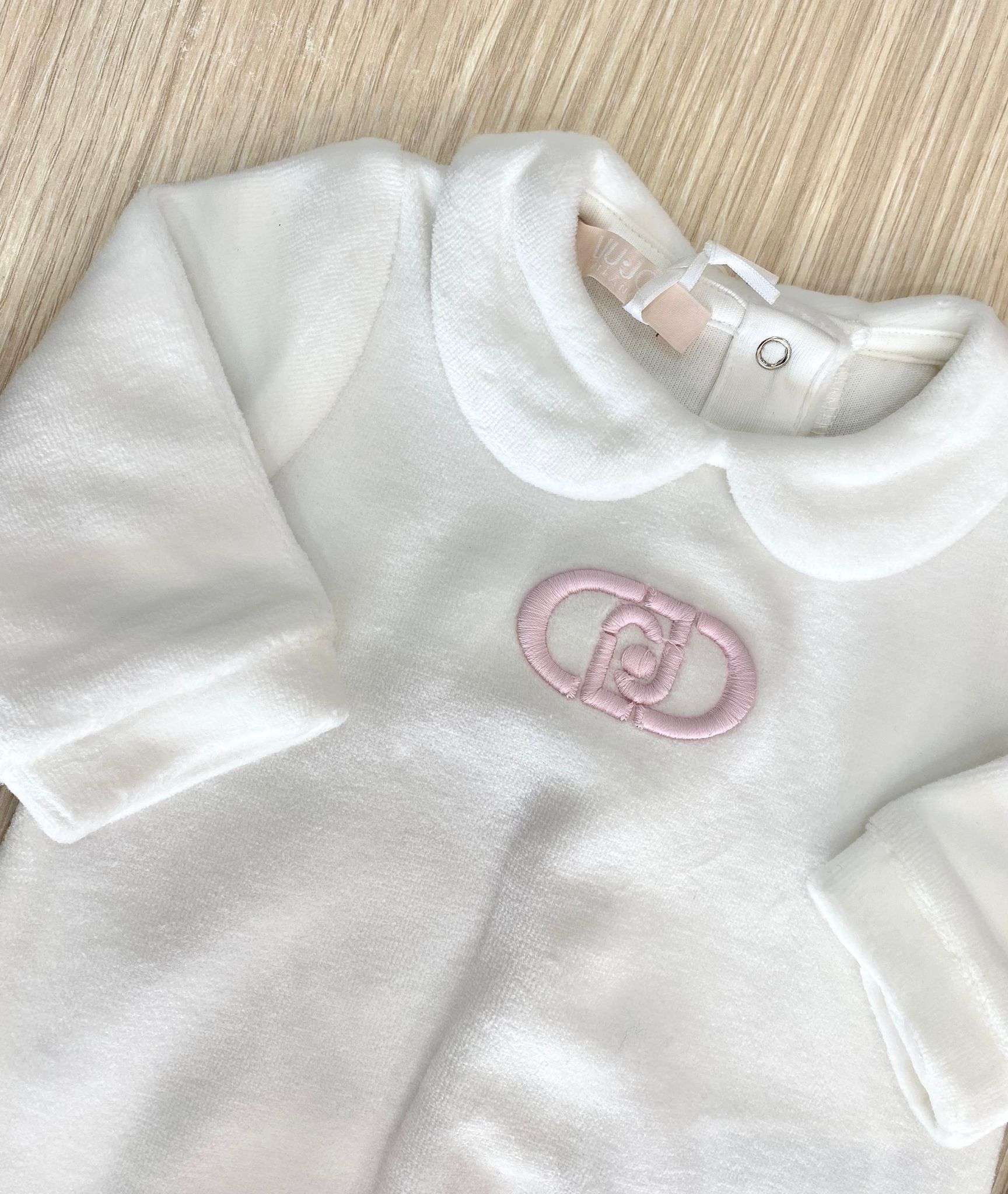 Tutina intera neonata in ciniglia, di colore bianco, con dettaglio di logo LIU•JO di colore rosa.