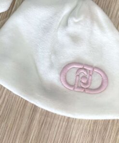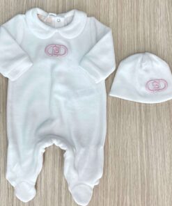 Tutina intera neonata in ciniglia, di colore bianco, con dettaglio di logo LIU•JO di colore rosa.