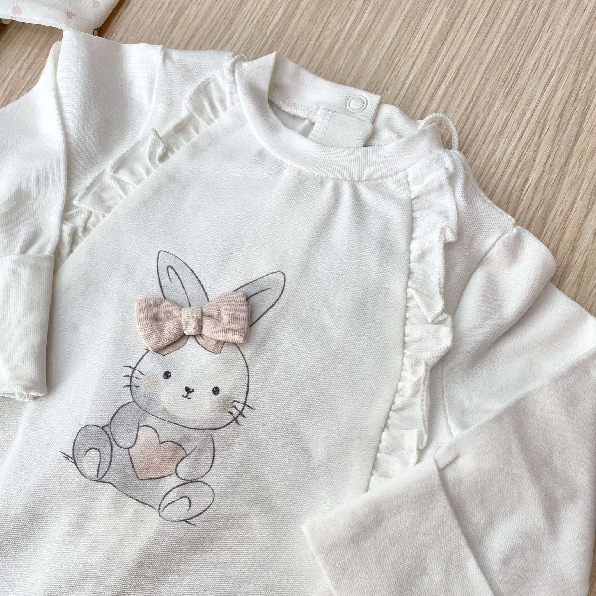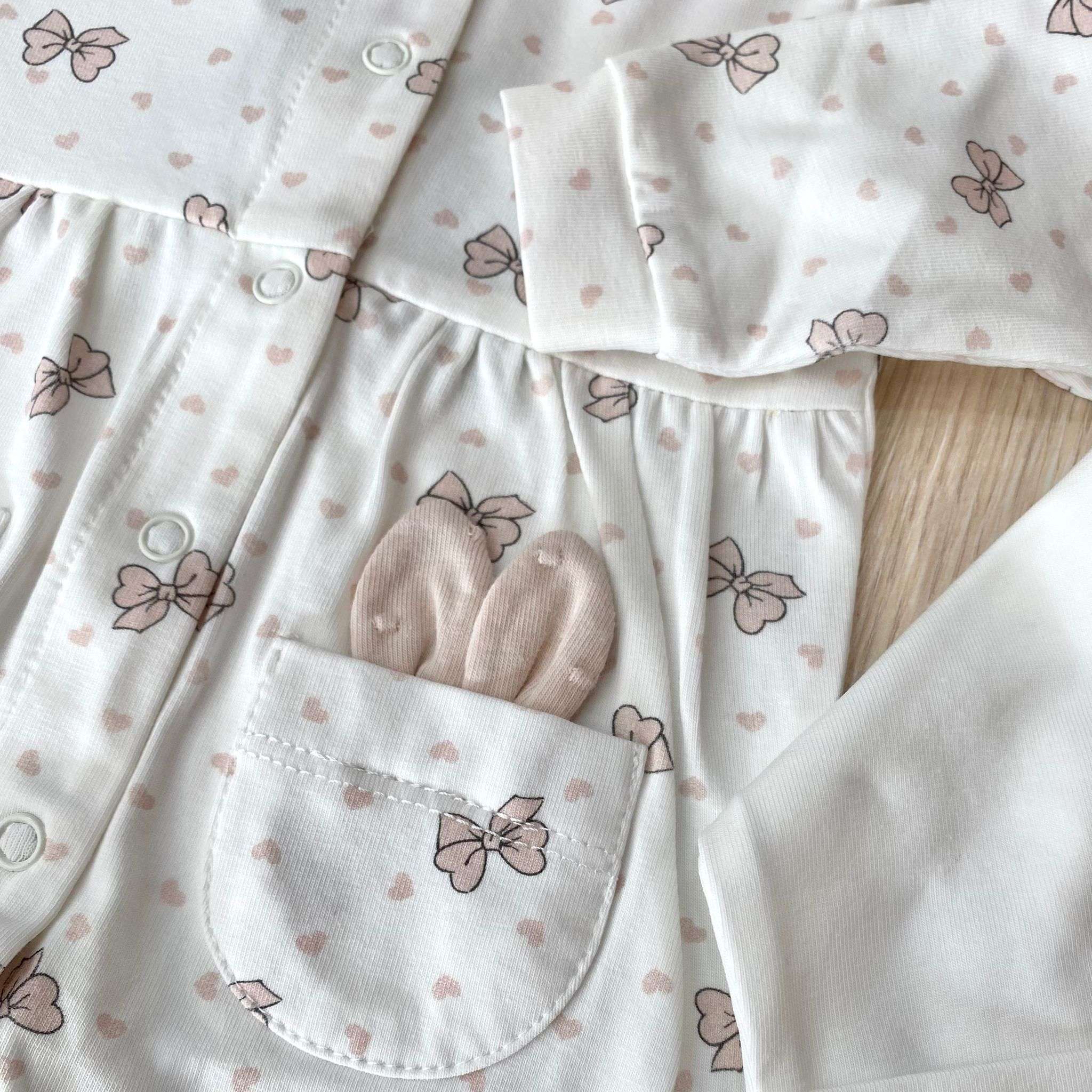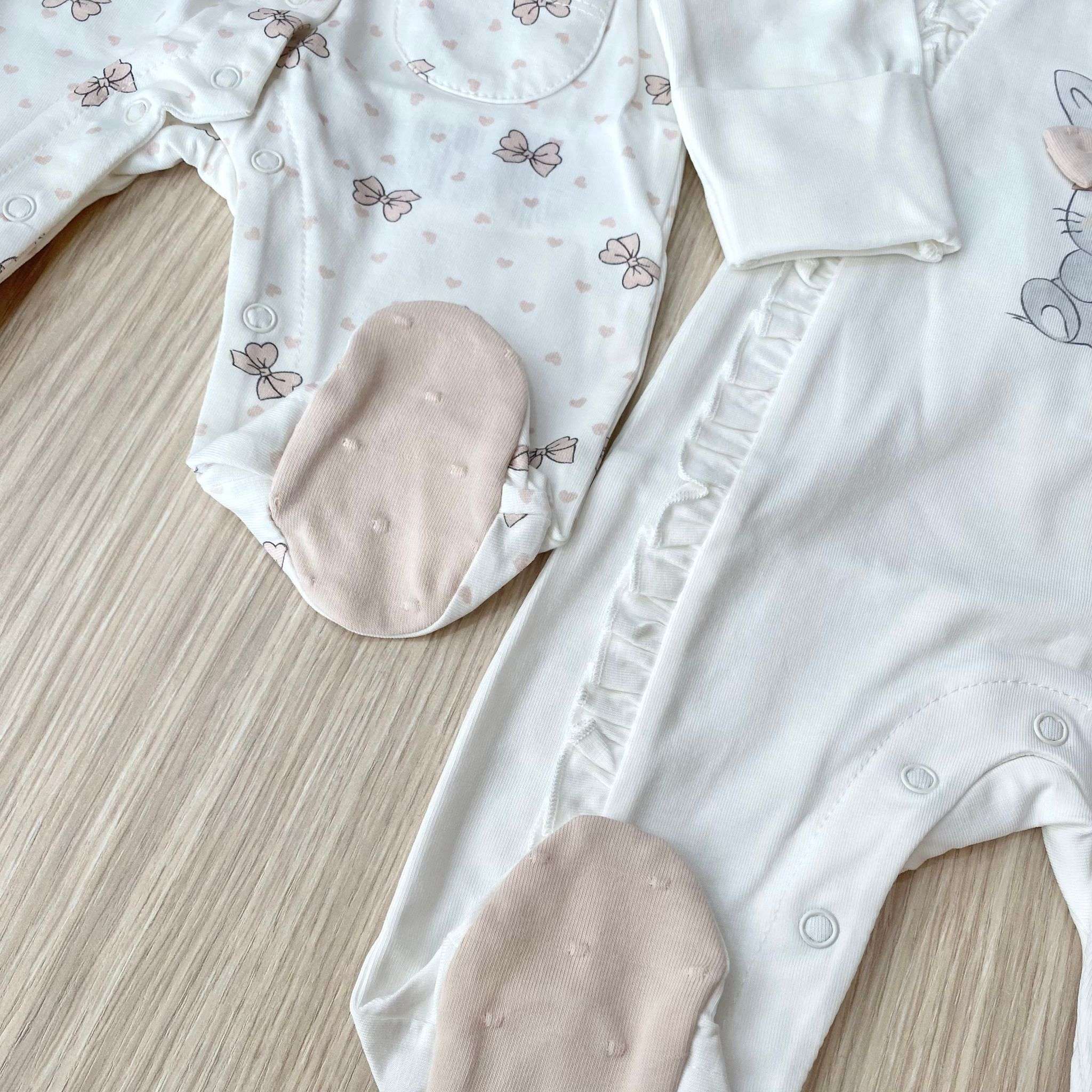 La prima tutina è decorata con una dolce fantasia all-over di fiocchetti e dotata di pratica chiusura con bottoncini a pressione. La seconda, in tinta unita, è impreziosita da una tenera stampa con coniglietto e romantiche ruches laterali, per un look raffinato e curato nei dettagli.