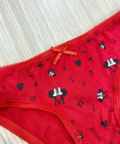 Slip bambina natalizio in cotone, di colore rosso, con stampa Minnie di colore bianco e nero, con applicazione di fiocchetto.