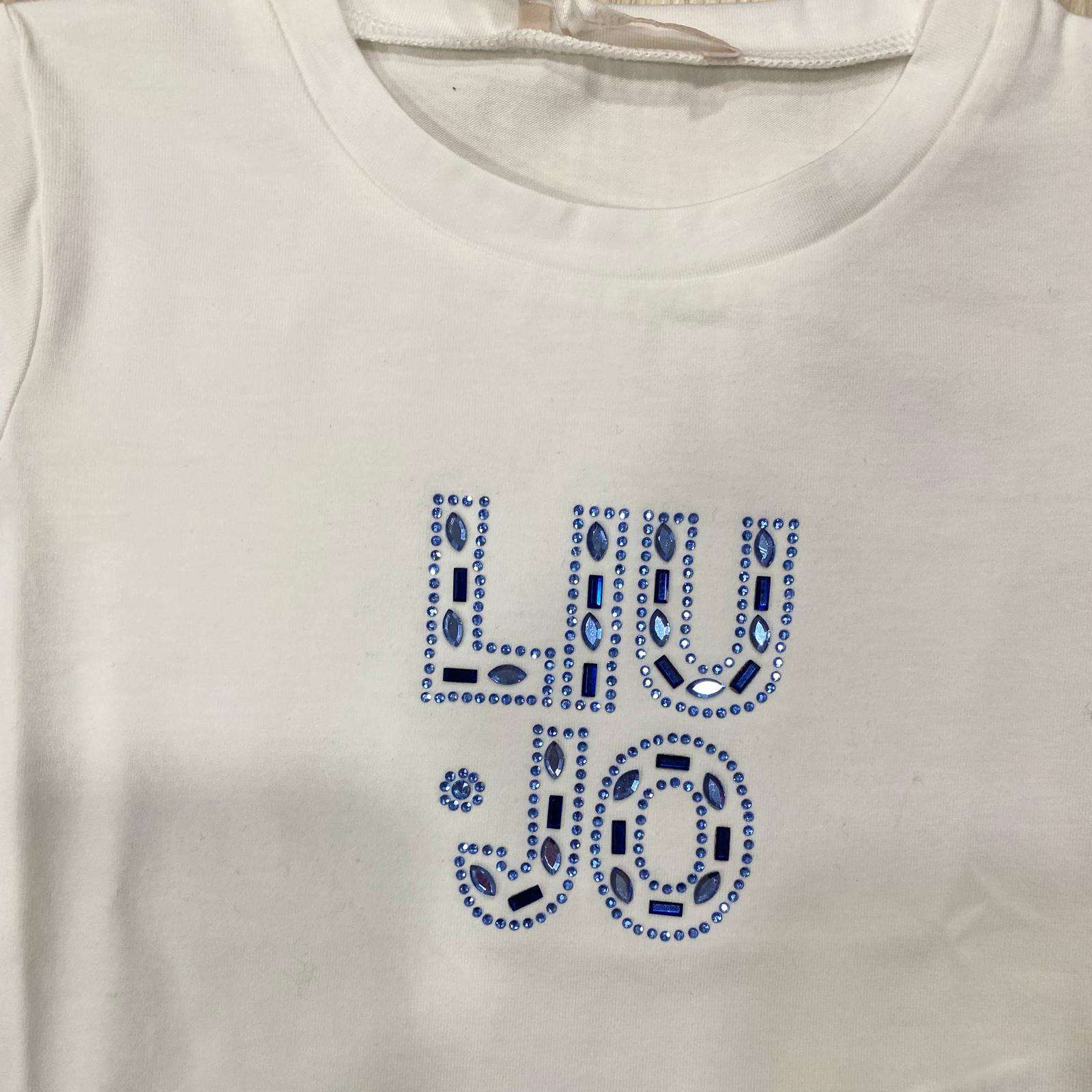 T-shirt bambina in cotone, di colore bianco, con strass di colore blu.
