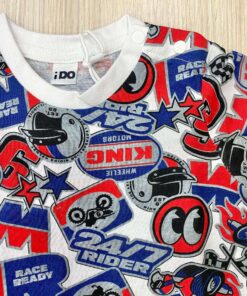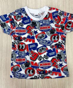 T-shirt bambino in cotone, di colore bianco, grigio, rosso e blu, con disegni.