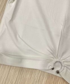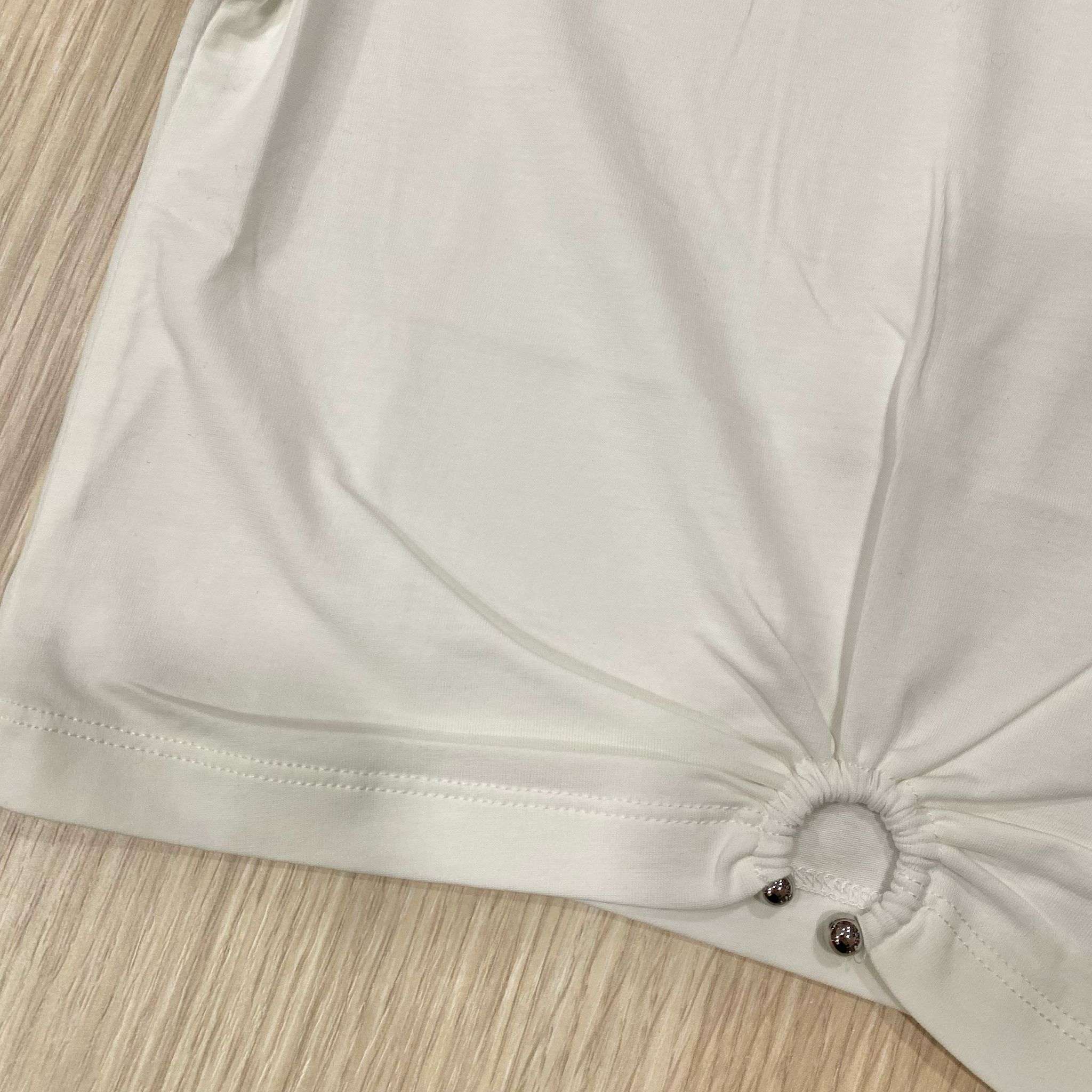 T-shirt cropped bambina/ragazza in cotone, di colore bianco, con arricciatura a cerchio e applicazione di palline argentate punzonate.