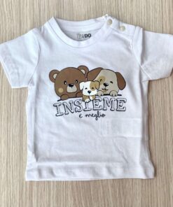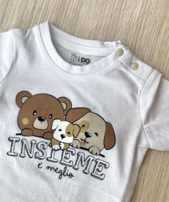 Il modello presenta una tenera stampa frontale con orsetto e cagnolino accompagnata dalla scritta “Insieme è meglio”, per un look tenero e affettuoso. I pratici bottoncini sulla spalla facilitano la vestizione, rendendo il capo perfetto per l’uso quotidiano.