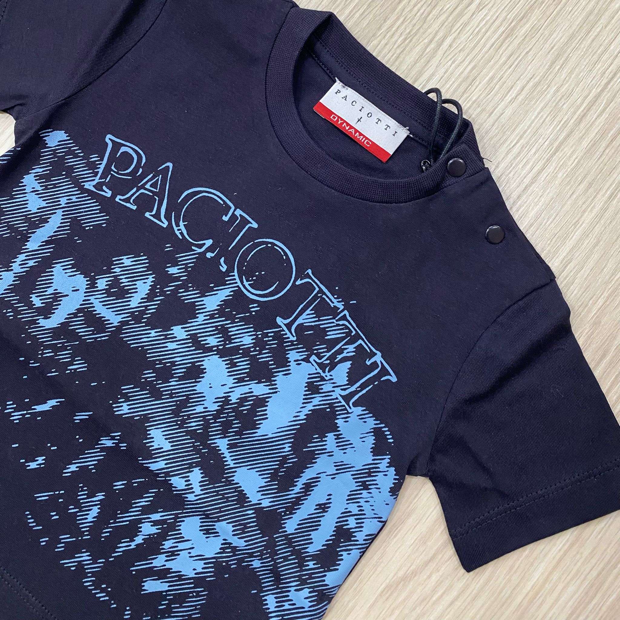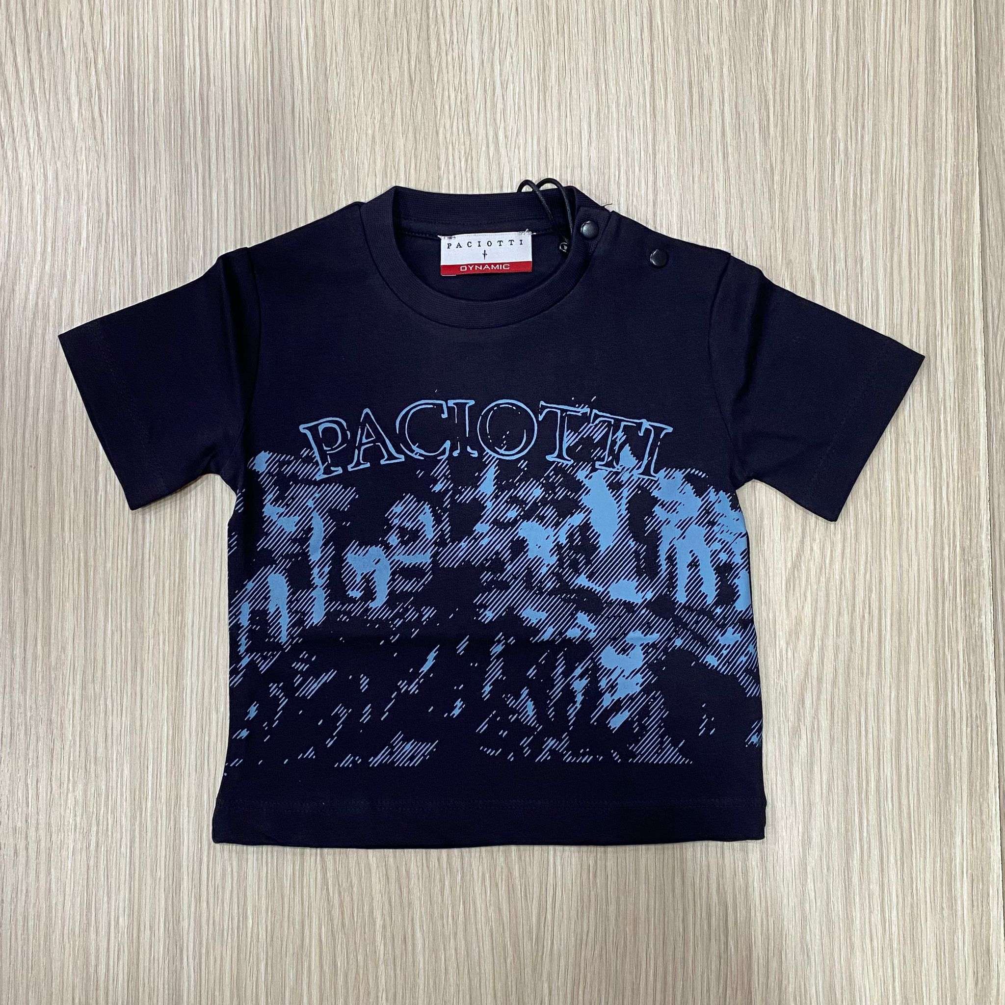 T-shirt neonato/bambino firmata Paciotti realizzata in cotone 100%, morbido e traspirante, ideale per garantire comfort durante tutta la giornata. Il modello presenta girocollo classico e vestibilità regolare, perfetta per un look casual ma ricercato. T-shirt di colore blu, con stampa di colore blu chiaro.